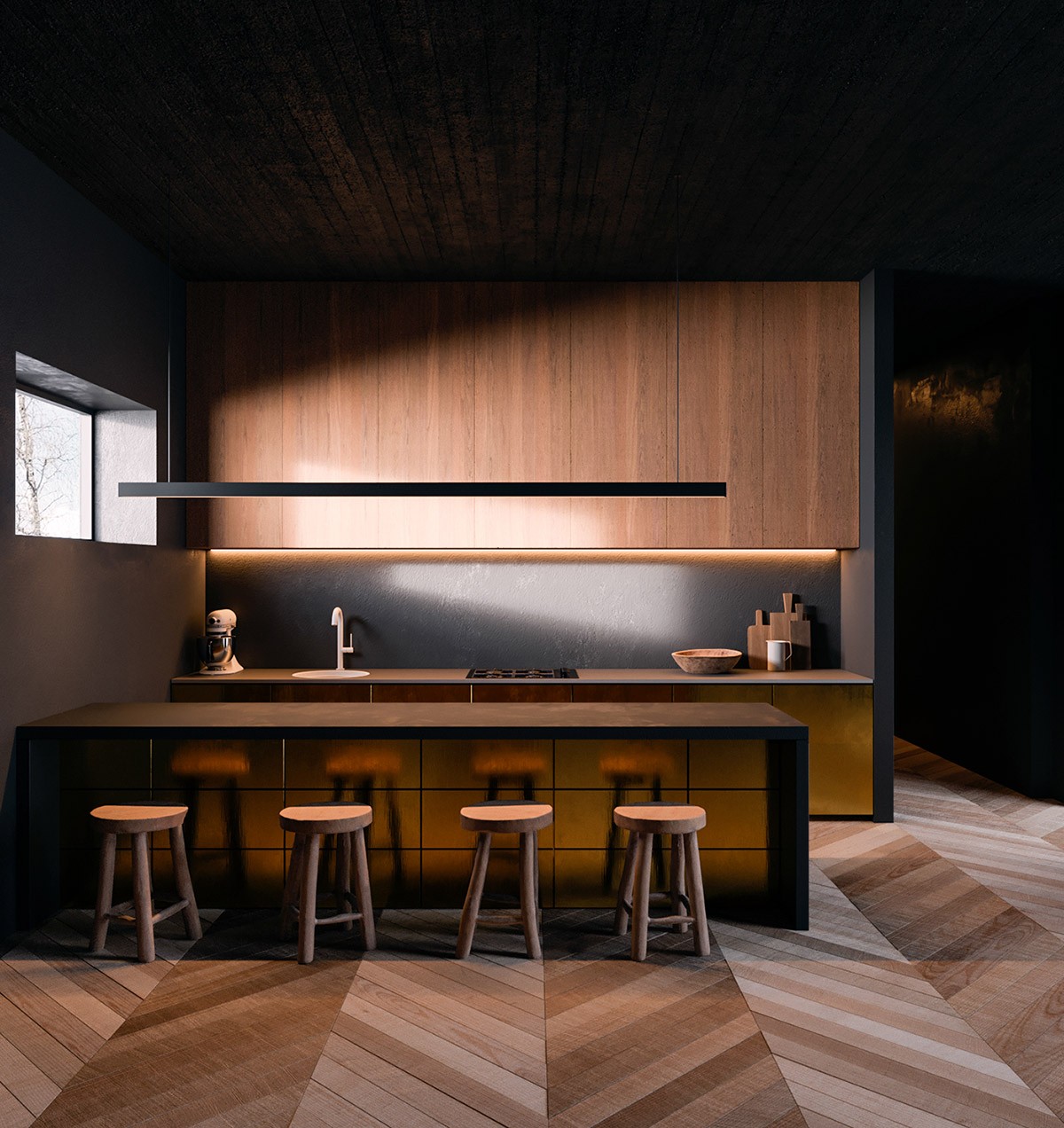 A linear suspension light accentuates a galley setup. Wooden bar stools reflecting off the metal surface of the counter add to the beauty.