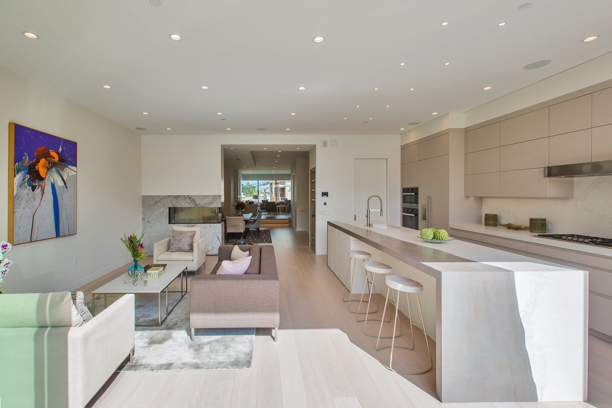 Install a lighting soffit rather than low hung pendant lighting for a no-fuss sleek modern kitchen.