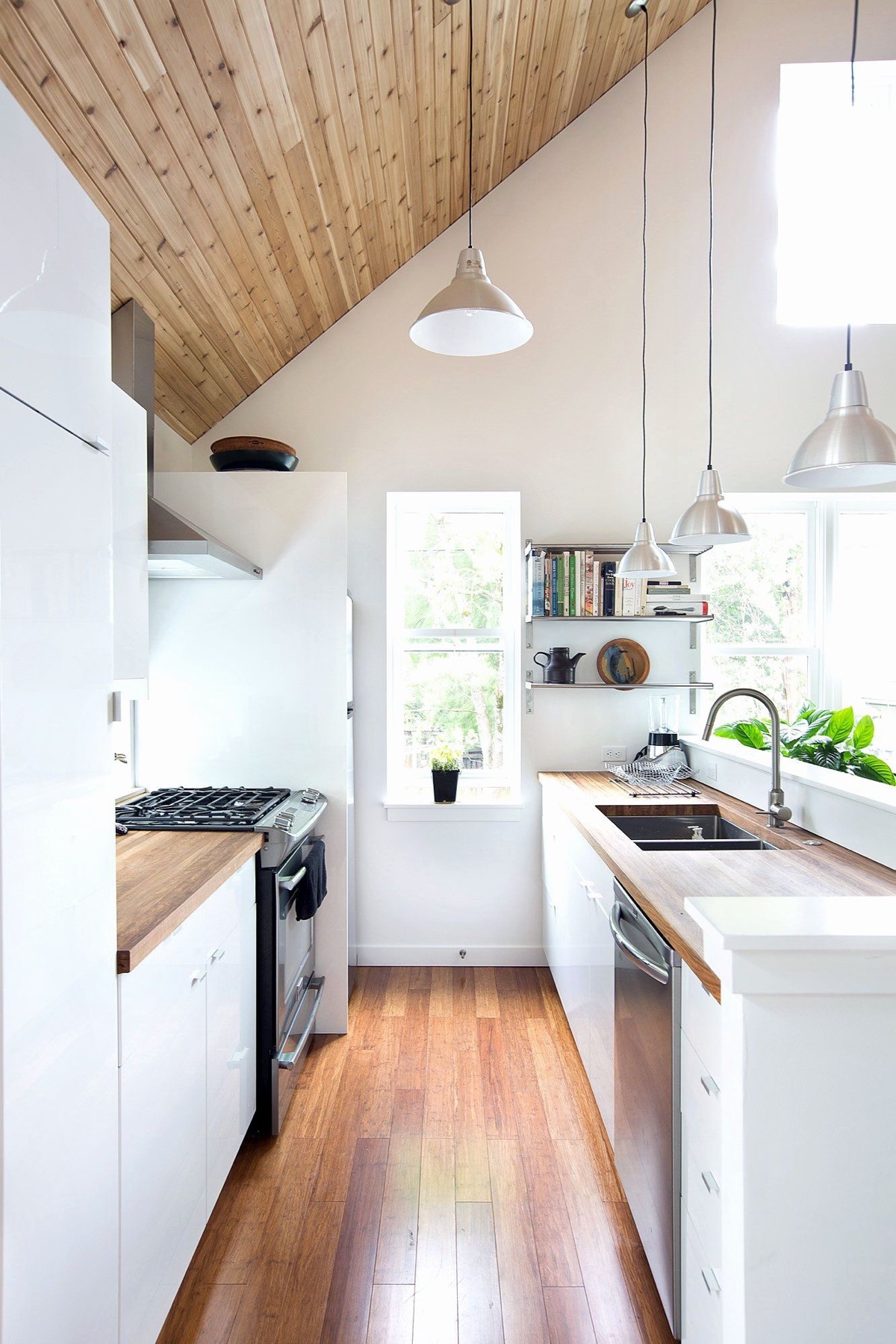 Add pattern in unexpected ways. This straight kitchen run receives some surprising twists up at roof level. Diagonal wood slats cut across the ceiling, with industrial style lighting hung in triangle formation.