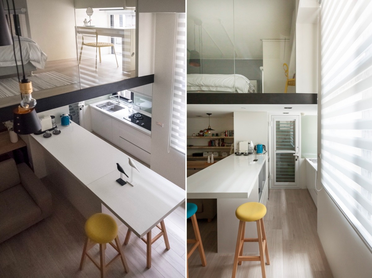 Lowering one side of the galley allows regular height dining chairs to be used instead of high bar stools.