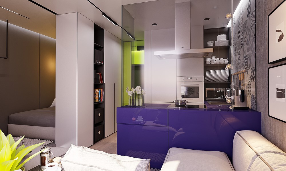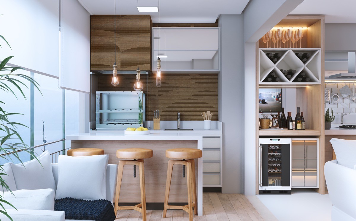 Screen off the mess. Fashion a partially dividing wall that climbs just a little higher than the back of your units in an open plan layout. The added height is just enough to screen off unavoidable cooking mess and dishes from the rest of the living room. Attach a narrow countertop on the divider to create a neat coffee bar, and finish with a few bar stools.