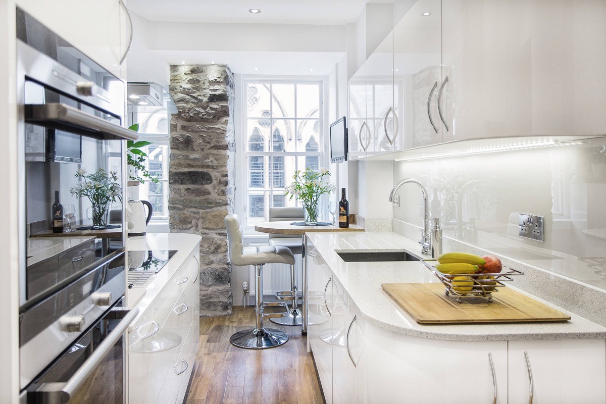 Galley kitchens don’t always look strictly straight...