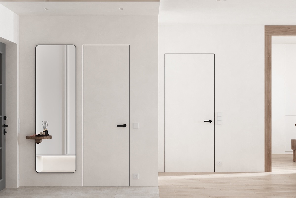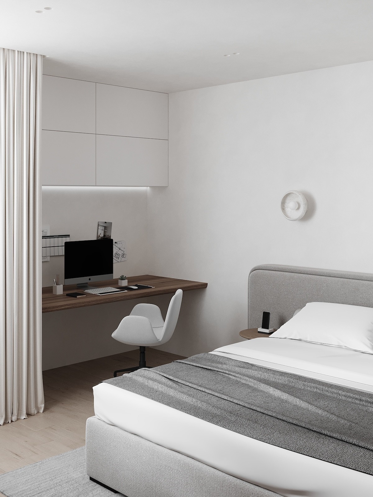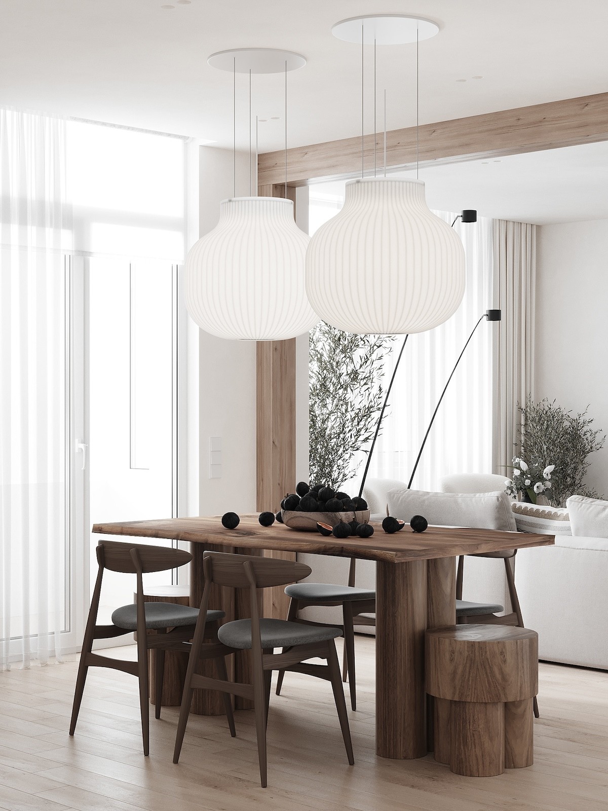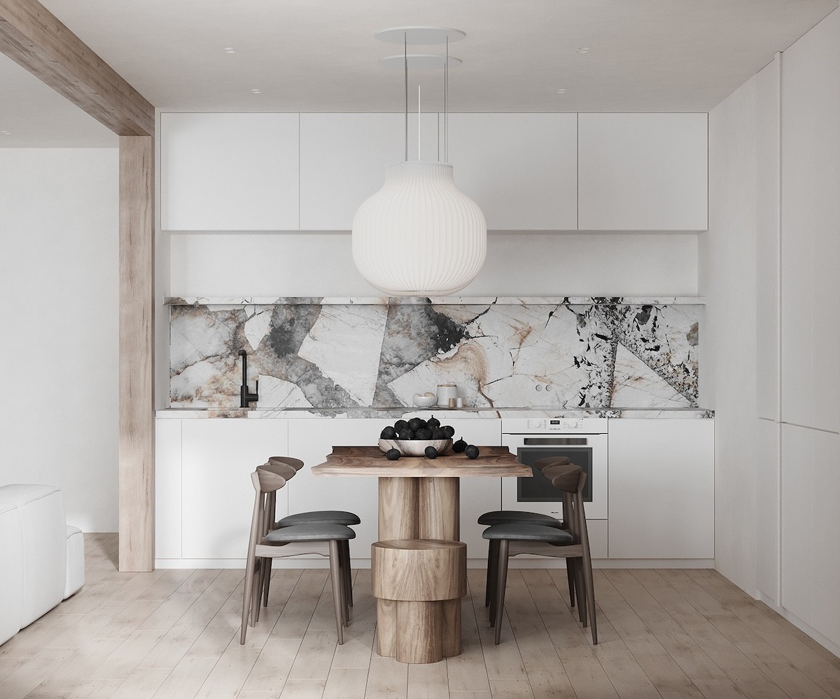 Created by Tomkin Design and visualized by Nastia Perchyk, this modern home interior is a soothing medley of gray, white, and wood accents. The earthy, wood-furnished dining room gives the fresh modern apartment a warm bohemian heart, which branches into other aspects of the home. Deep wooden door reveals and chunky timber surfaces counteract cool white backdrops. Oversized pendant lights make unexpected, attention-grabbing focal points. Bespoke built-in furniture designs give the apartment a clean aesthetic, as well as an abundance of storage and home organization opportunities. The bedroom is a minimalist setting with cozy undertones, while the compact bathroom offers inspiration for endowing small spaces with style.