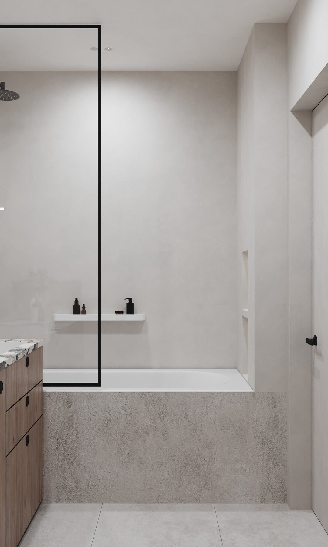 A fitted bathtub with microcement casing gives the compact space a streamlined modern appearance. Built-in shower shelves and a floating toiletries shelf keep bathroom supplies in check. Black soap and lotion dispensers make commonly used products match when out on display. A black-framed shower screen adds a sharp, contemporary accent.