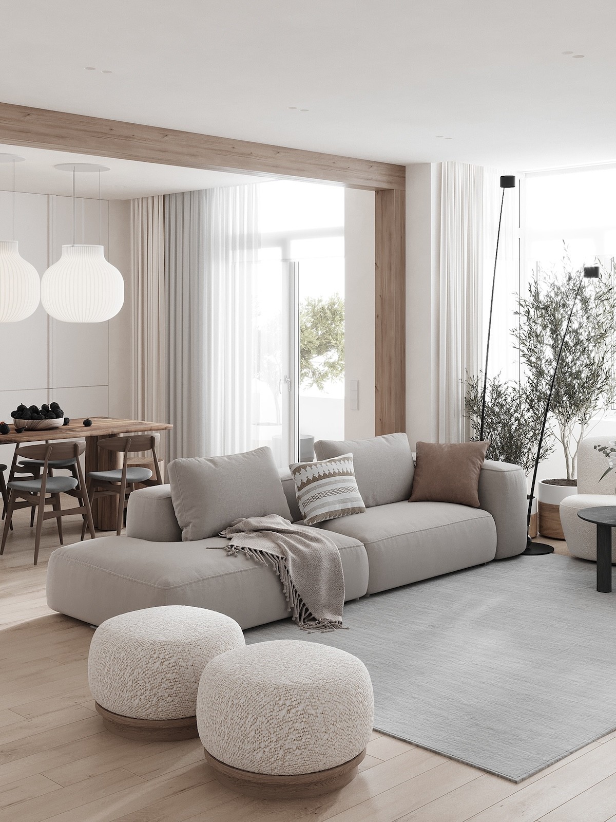 The gray sofa constructs an open and inviting profile in the living room, with the arm rest omitted on the side of the home entryway. Two modern boucle poufs create a low visual divide between the living room and entryway to help zone the free-flowing layout. A gray living room rug adds an island of soft contrast in the center of the wood laminate floor.