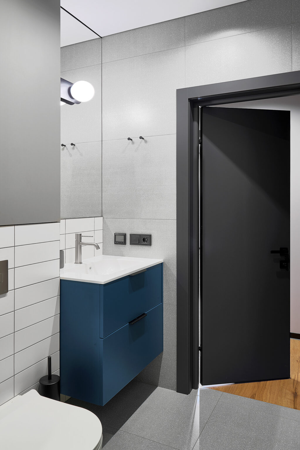 Things are looking crisp & modern in the bathroom. Light grey tiles prevent the interior from feeling too boxed-in, while the blue vanity ties back to the palette used throughout the apartment. White subway tiles break up the grey and make the sink area feel brighter.