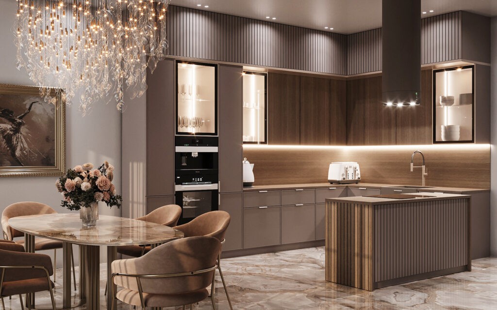 Yulia Kashkarova’s “Bright Kitchen with Chocolate” embodies a refined interplay of texture, tone, and light. Inspired by the soft richness of Mocha Mousse, this design creates a harmonious balance between earthy warmth and contemporary sophistication. The ribbed wooden paneling behind the TV infuses depth and character into the dining area, while a marble-textured wall adds a touch of luxury.