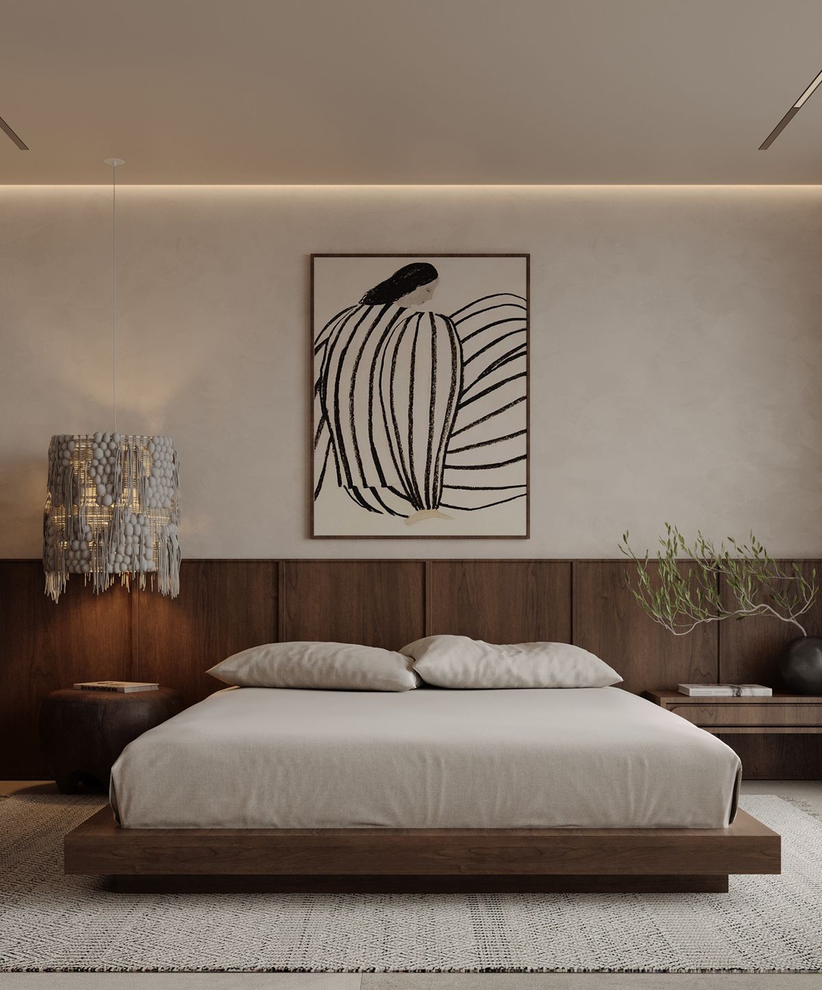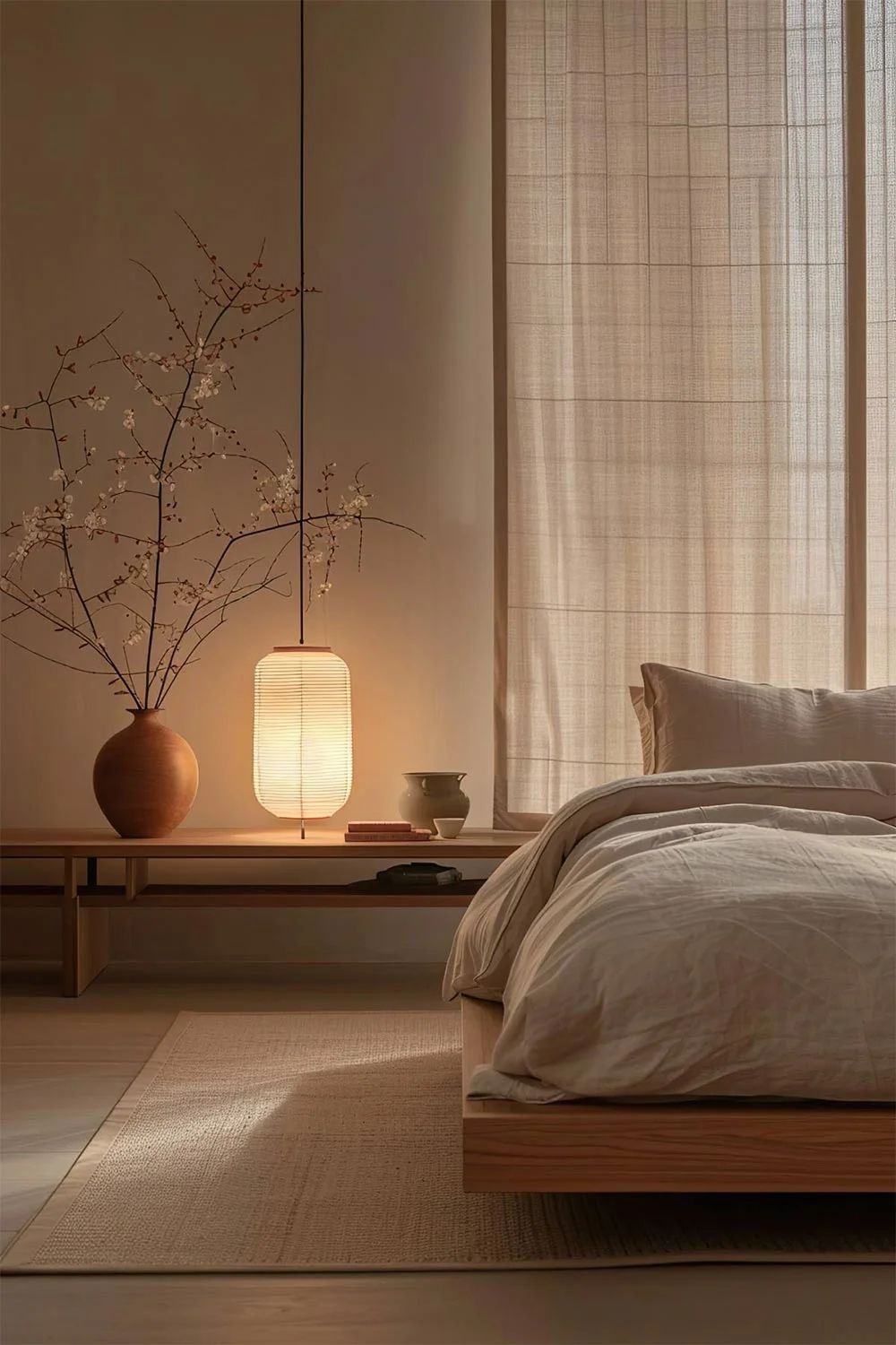 Rather than removing décor entirely, Japandi Bedroom 2.0 embraces fewer items with more meaning. A ceramic vessel, a hand-thrown bowl, a framed textile, or a single piece of art adds quiet personality. These objects aren’t chosen to fill space, they’re chosen to connect emotionally. This approach keeps the room deeply personal while maintaining visual calm, reinforcing the idea that rest is supported by emotional comfort as much as physical design.