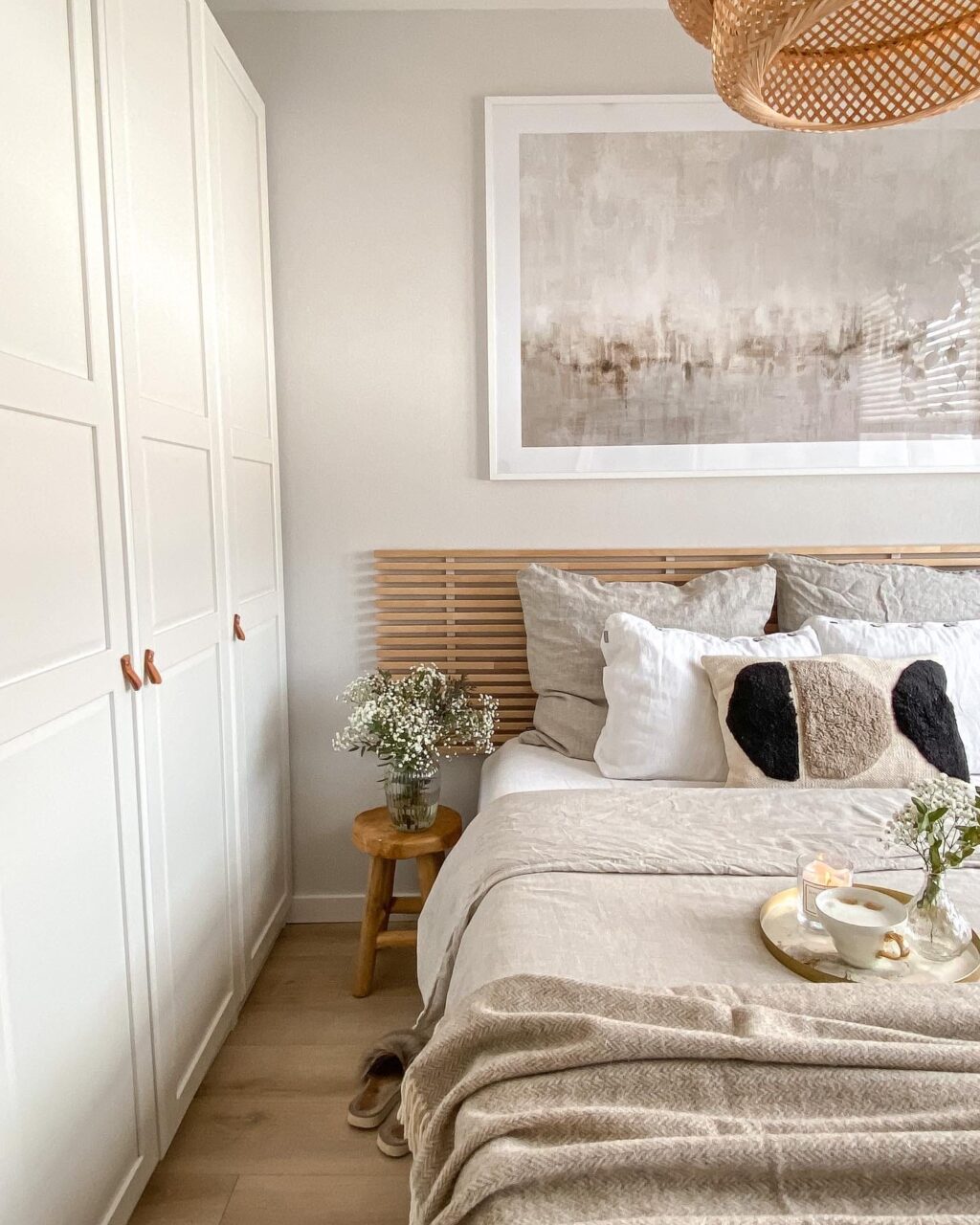 Japandi Bedroom 2.0 moves away from stark whites and cooler greys, leaning instead into warmer, earth-inspired neutrals. Shades like sand, oat, clay, mushroom, and soft taupe create a cocooning atmosphere that immediately signals rest. These colors feel grounded and natural, helping the bedroom feel emotionally calming rather than visually sharp. When layered thoughtfully across walls, bedding, and textiles, warm neutrals blur boundaries and reduce contrast, key for creating a space that supports deep sleep and mental unwinding.