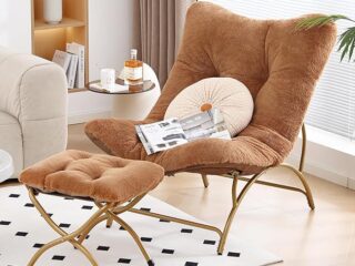 A plush reading chair is essential for every maximalist nook. This brown lounger with an ottoman invites relaxed vibes. You can add on cushions and throws to create your personal reading or contemplation corner.