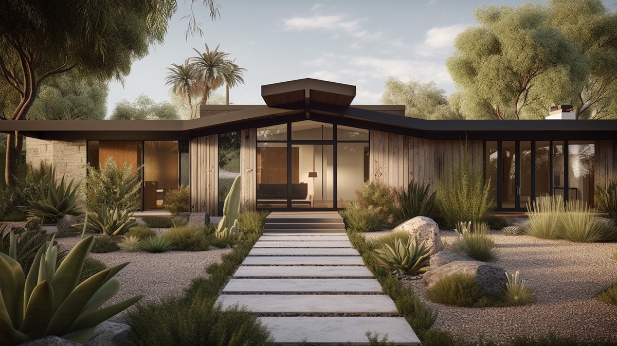 So far, we have looked at real-world works built or renovated by architects. Now, let's see what an AI can conjure up based on purely text-based prompts, depicting the mid-century style. As always, keep in mind the technology is still nascent, so you will find glitches if you look closely enough.