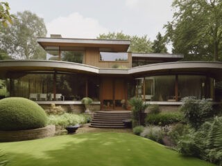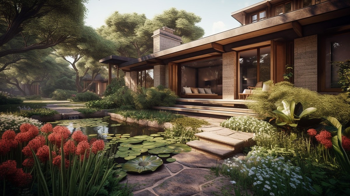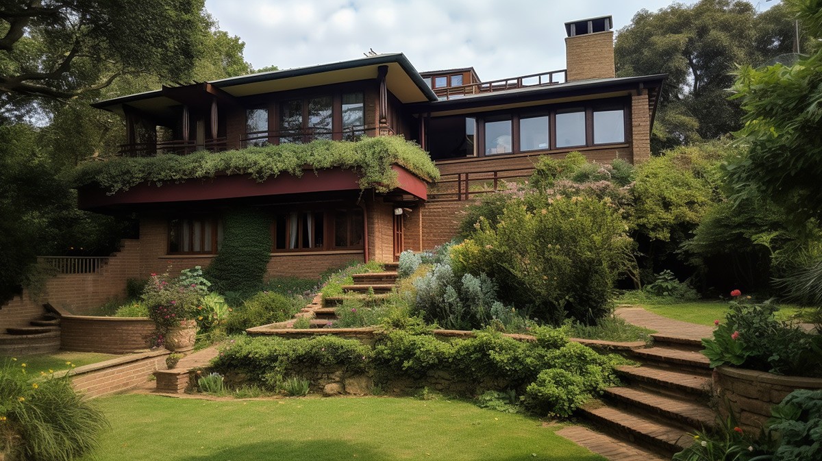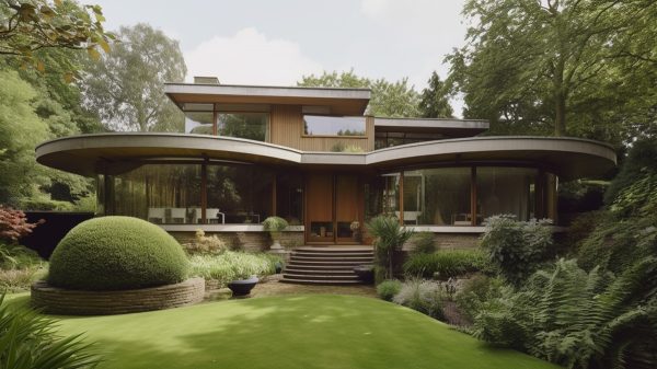 Hilly terrain is converted from an awkward architectural challenge to a magical, sloping mid-century garden and grand residential dwelling by AI.