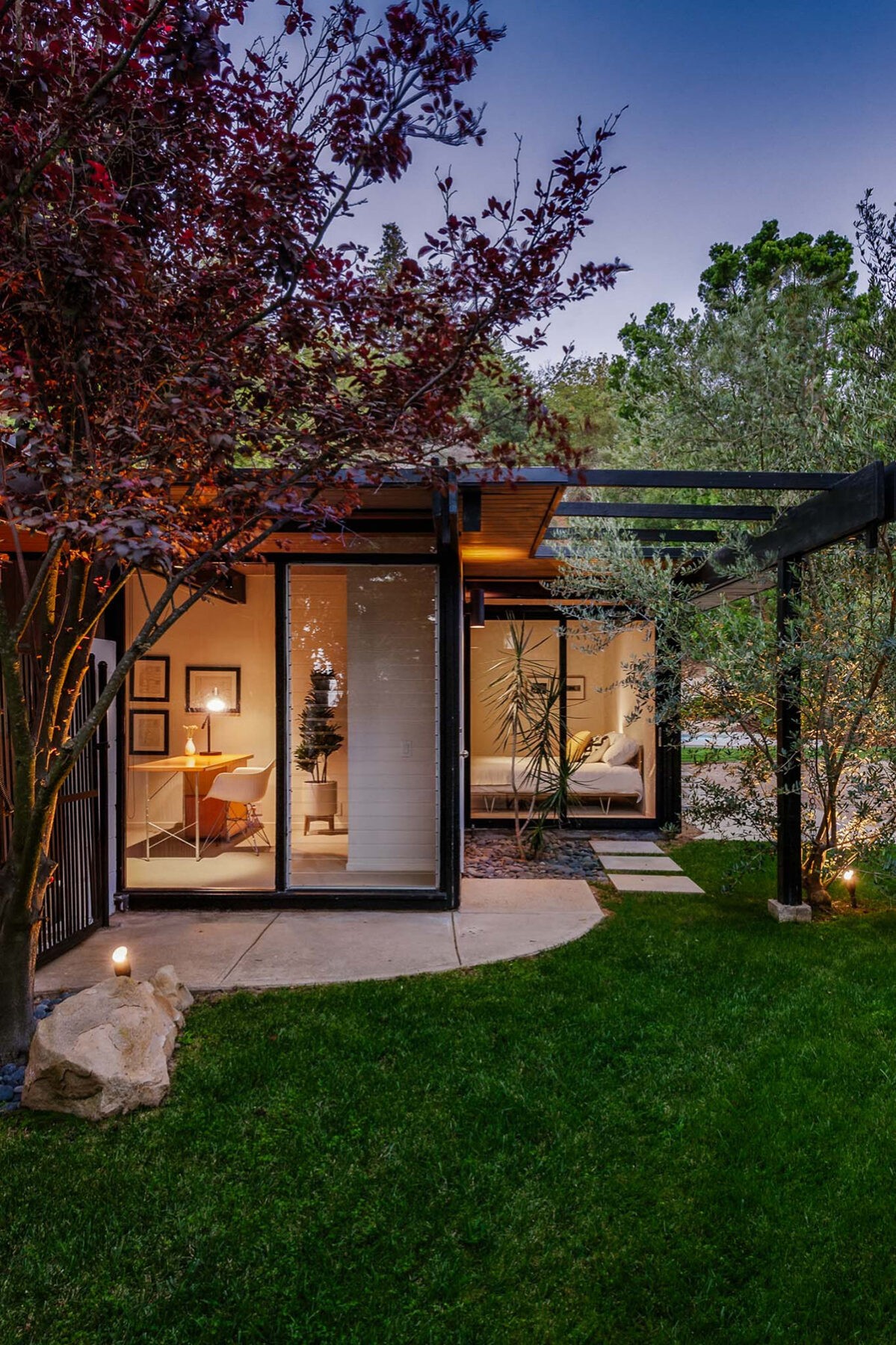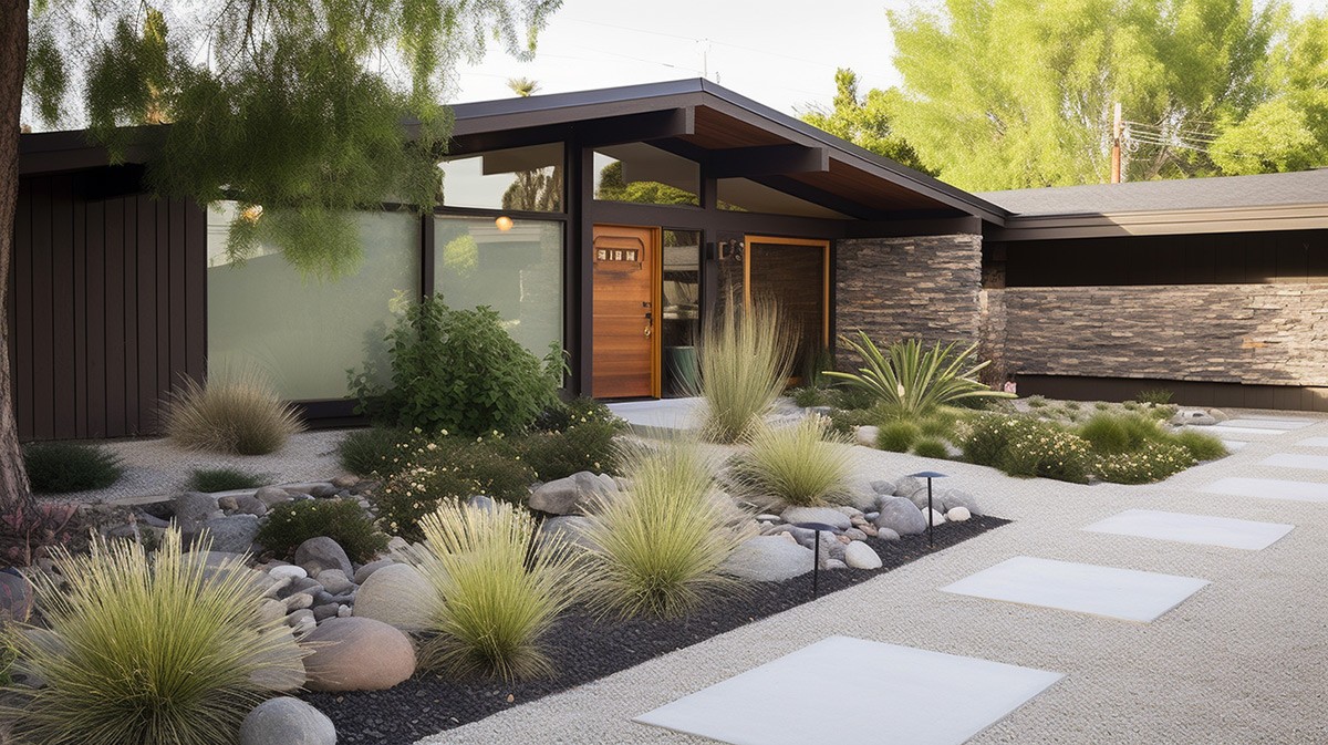 The roofline of this stylish mid-century modern home gracefully extends into a pergola, adding a touch of elegance to the manicured garden.