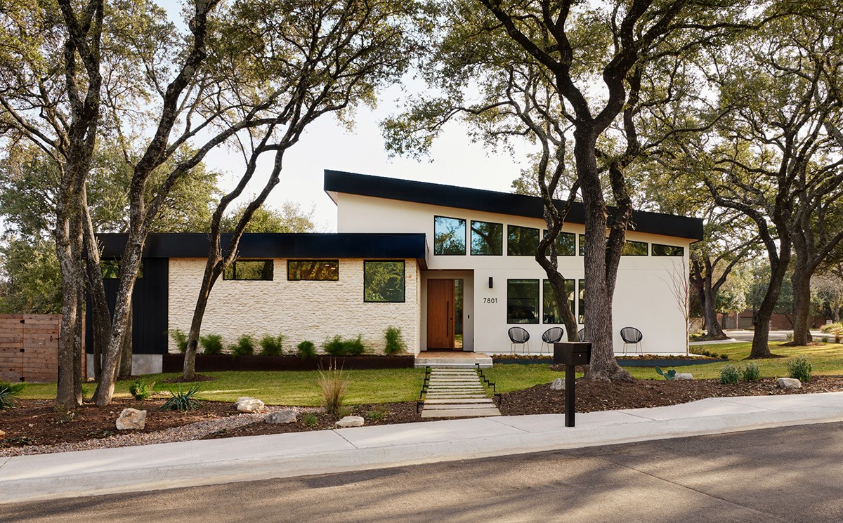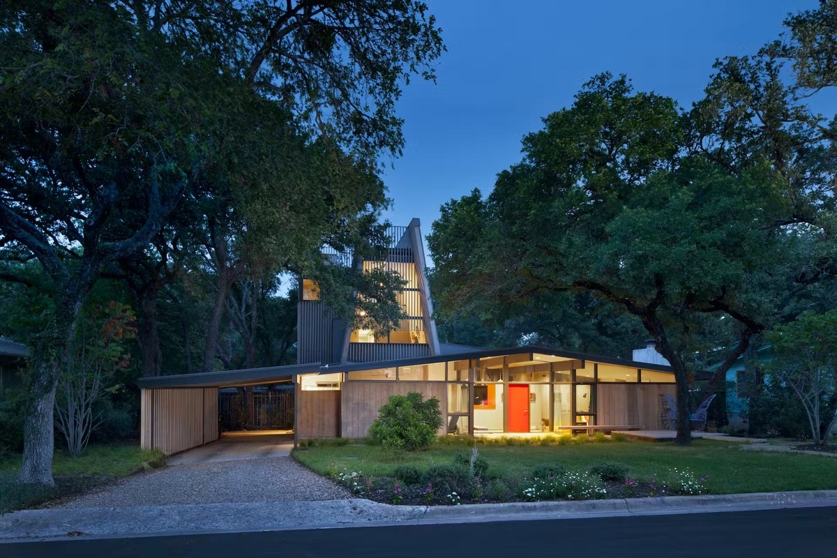 This Texan mid-century modern home remodel features an enhanced sloping roof construction that redefines its silhouette and opens the home up to more natural light. The original, lower-pitched roof was raised in 2017.