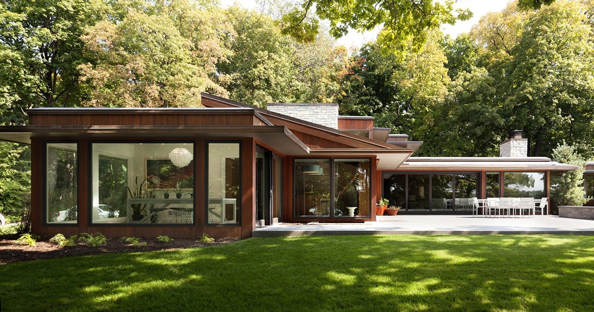Careful renovation maintained the mid-century modern character of this home while enhancing its connection to the lakefront site with huge windows and an inviting terrace.