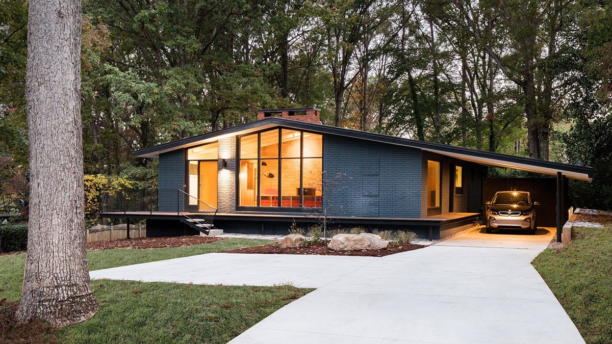 Exuding modest charm, this cozy mid-century modern house nestles in a tree-shaded landscape. Its ruddy color scheme is reminiscent of the vibrant autumn foliage, warmly blending with nature's seasonal transformation.