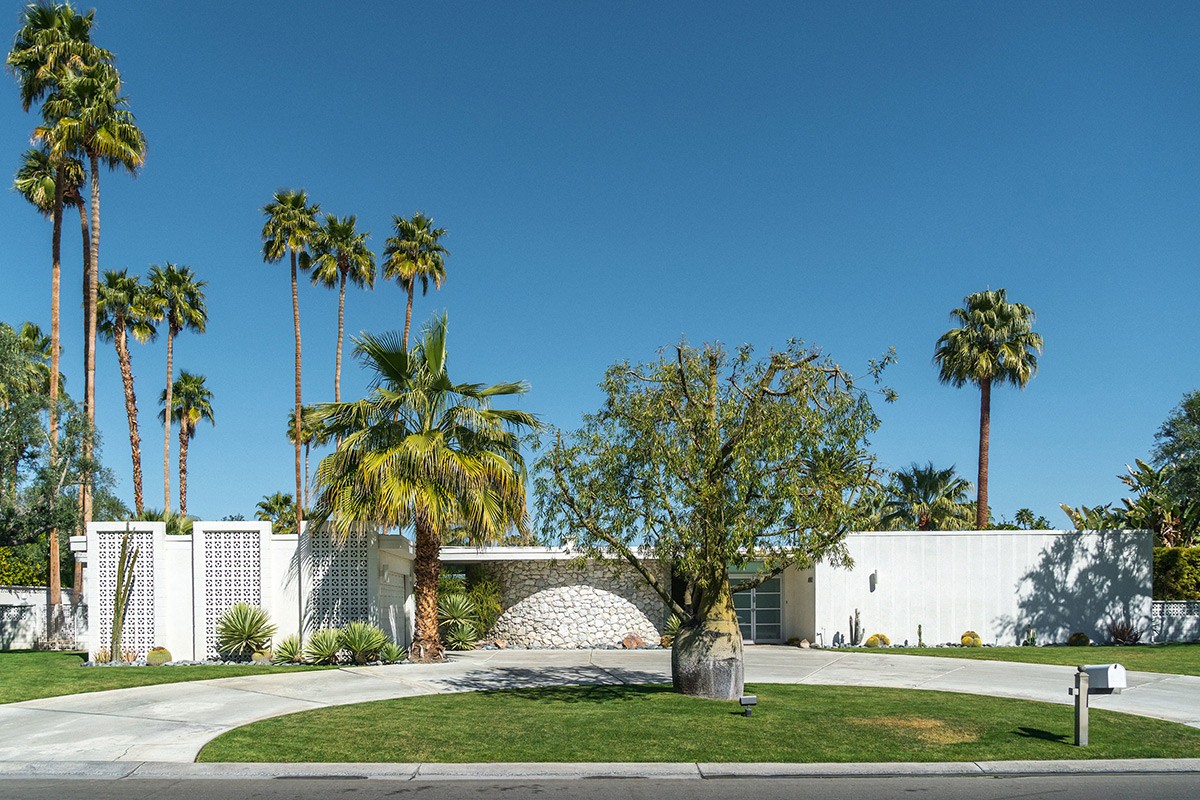 A sunny yellow door acts as a visual magnet toward the entryway of this mid-century abode. Mature palm trees tower above the flat roofline.