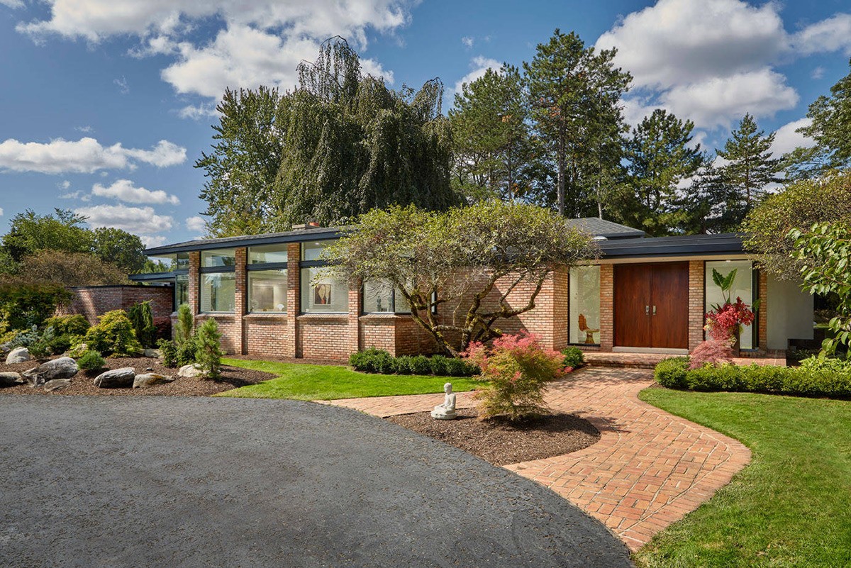 A curved driveway offsets the linearity of flat-roofed mid-century modern architecture.