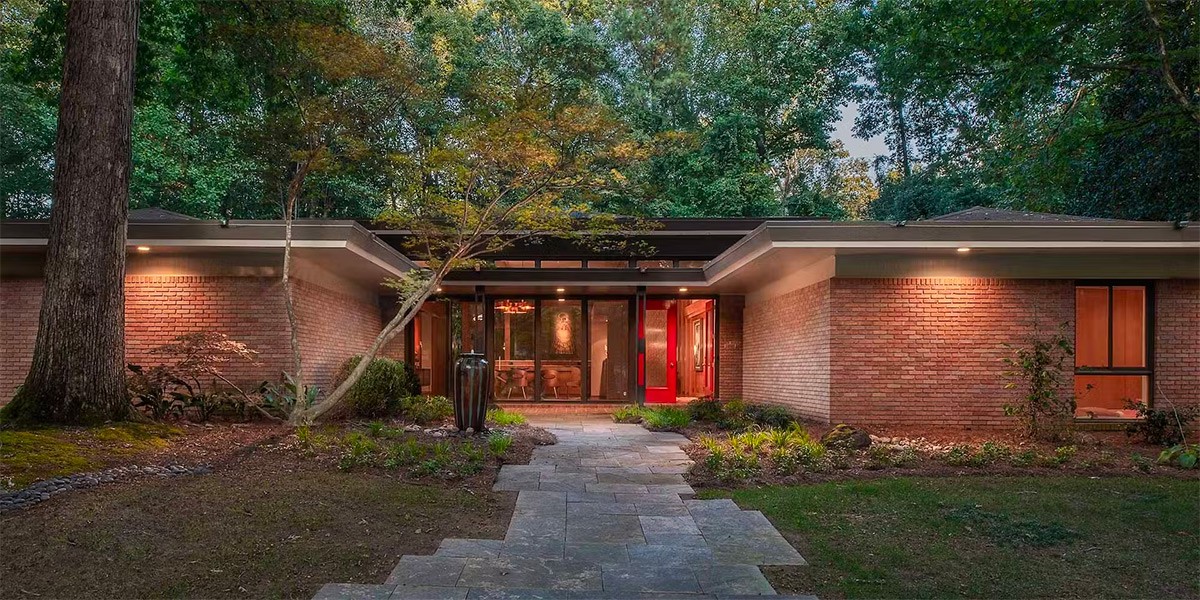 With its red brick exterior and striking black window frames, this mid-century modern house boasts a distinct charm. A low-pitched roof crowns the design, while a continuous line of windows threads the perimeter, flooding the interior with natural light.