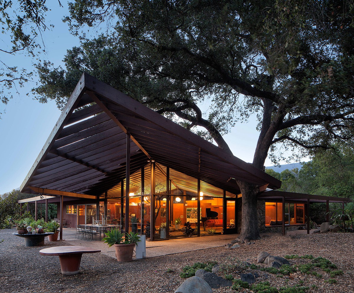Characterized by a pitched roof extending over a terrace, this mid-century modern home smoothly combines indoor and outdoor living, providing a covered alfresco dining area.