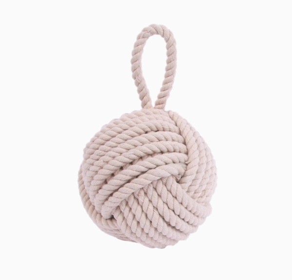Covered in stylish rope and weighted from the inside, this piece would look great in a sea or sailing themed room. The knot shape resembles a Monkey's Fist, a knot commonly used by sailors to add weight to the end of a heaving line.