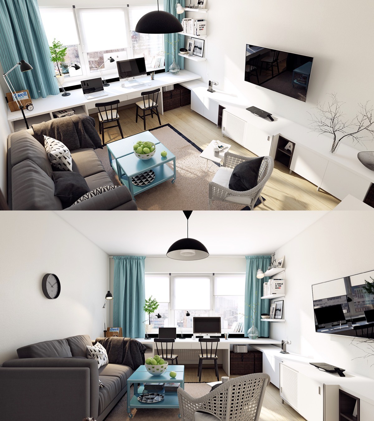 You don't need a ton of space to execute on these ideas. Complementary shades of teal(in the lounge chair & modern sofa) and ultra smooth lines are perfect here.
