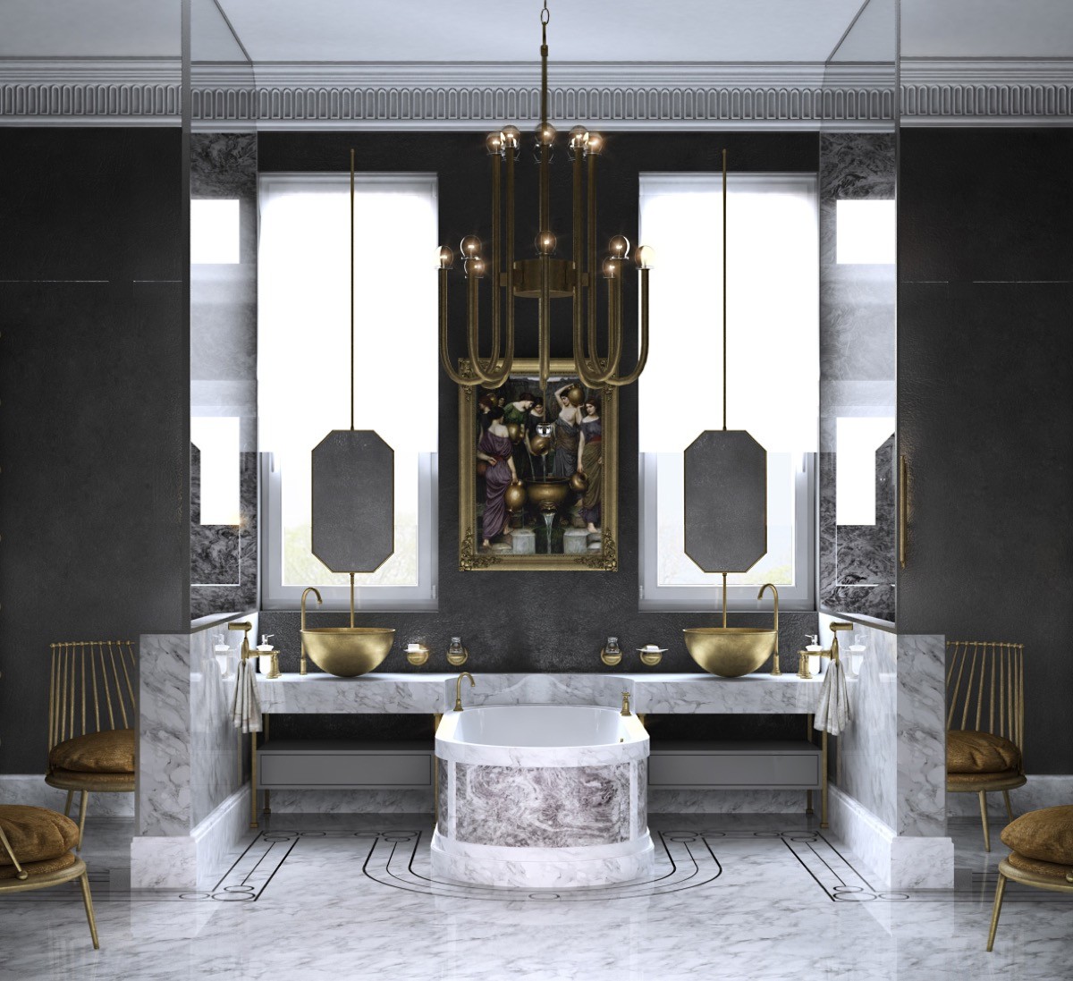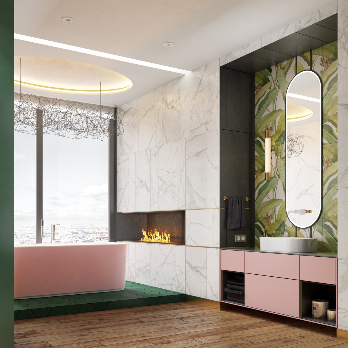 Suspend lighting over the tub. Nothing else has quite the same decadence in a bathroom like a piece of statement lighting suspended over a freestanding bathtub; be it a sparkling chandelier or shining globe pendant lights.
