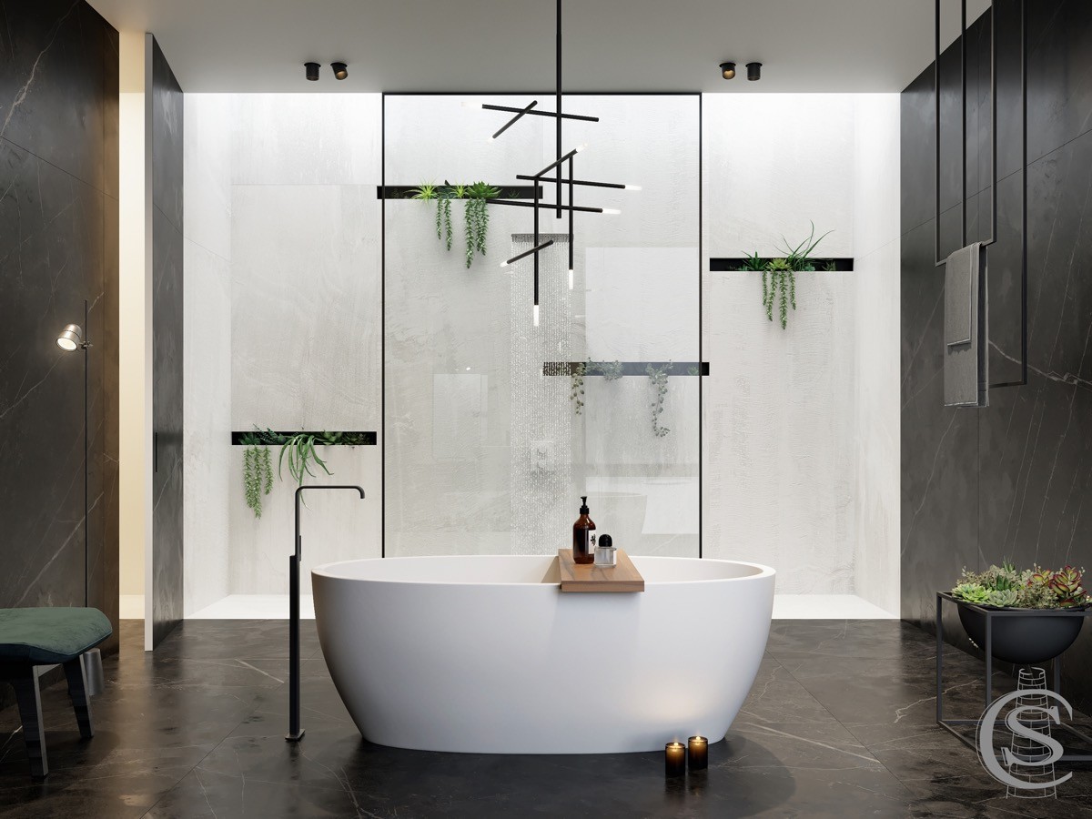 Frame your hero piece. Two unique plant stands frame an elegant freestanding bathtub.
