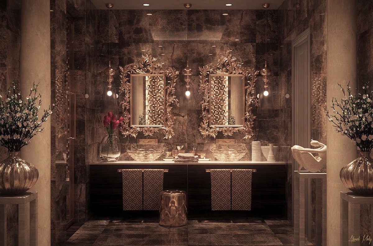 Evoke grandeur with ornate accessories. Luxury hotel bathrooms are often filled with ornate vanity mirrors and sculpture that can be translated into our very own luxury home bathroom.