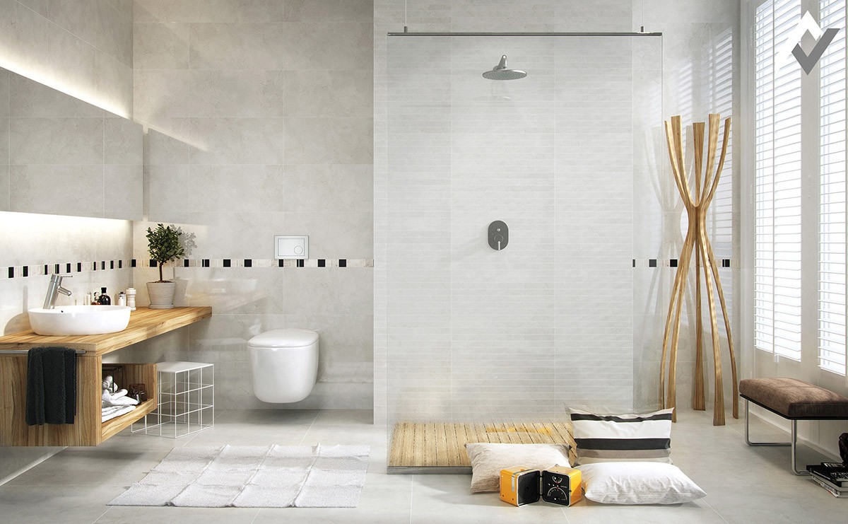 Zone with different flooring materials. The border to this wet zone is accentuated by a geometric section of wood flooring, which continues upward as bathroom TV wall decor.