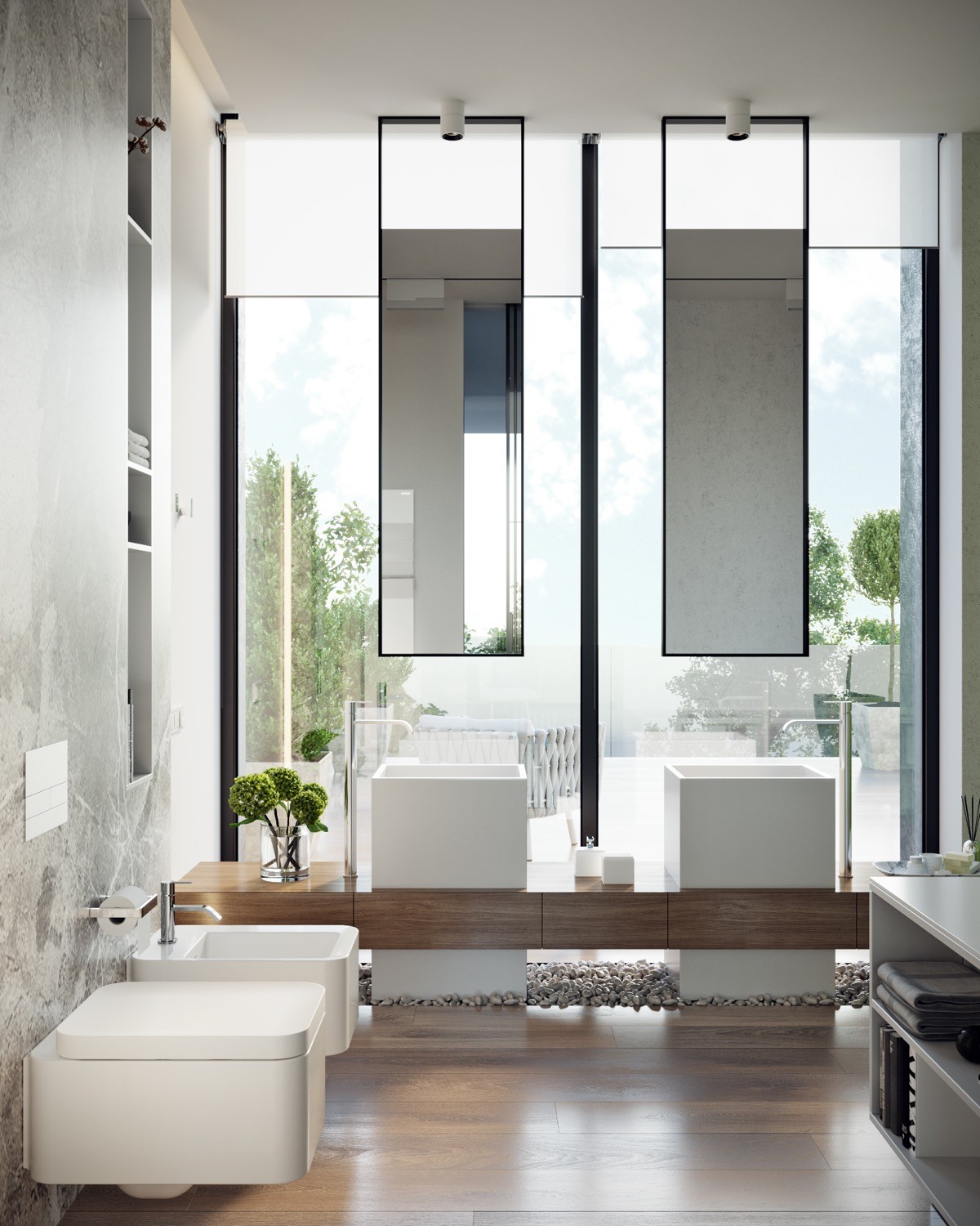 Make it a double. A twin vanity unit can be accessorised with a single large mirror, though doubling up mirrors and modern wall sconces certainly draws more attention to the luxury of having two individual wash zones.