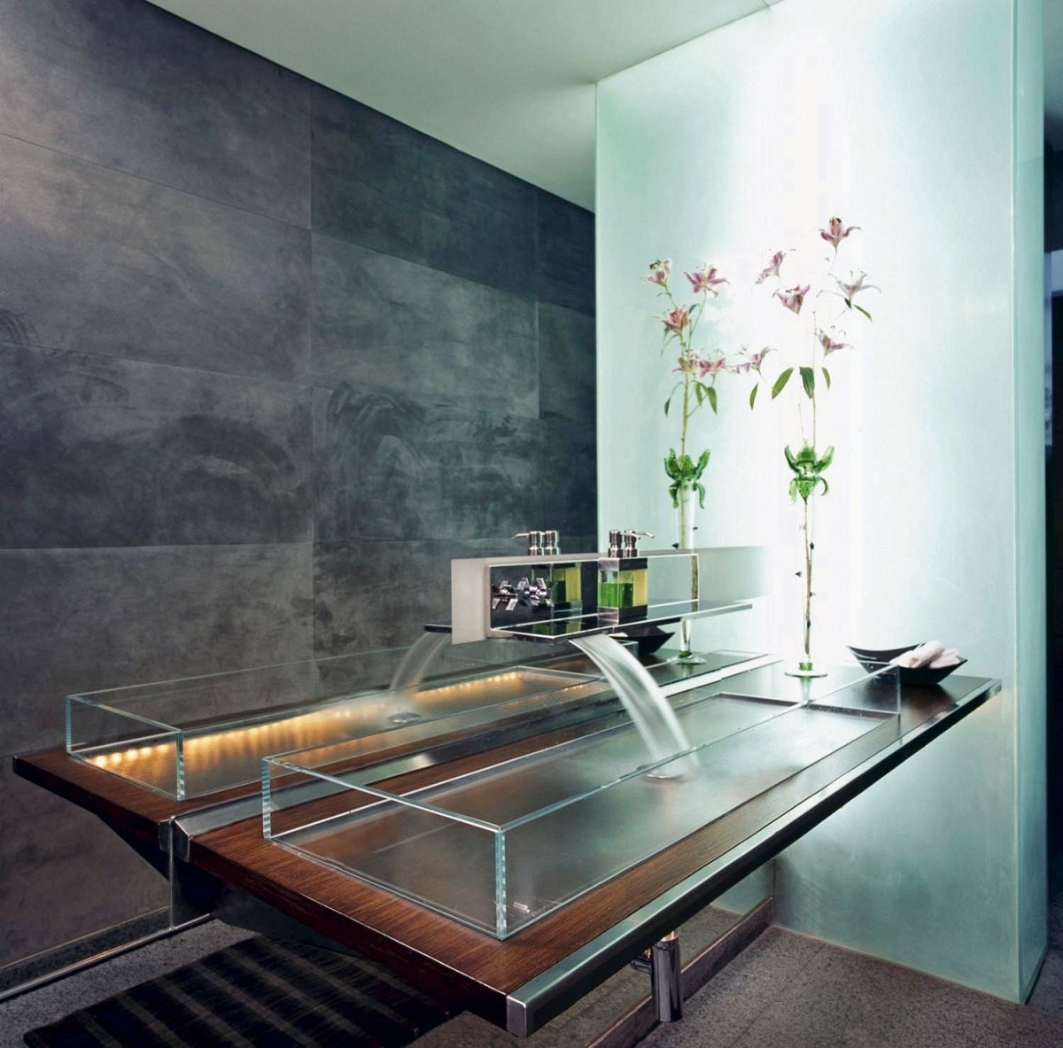 Make a plain basin look special with a unique faucet. Ok, so this bathroom sink is anything but boring. However, the waterfall faucet certainly does add to its splendour.