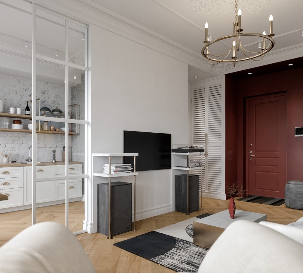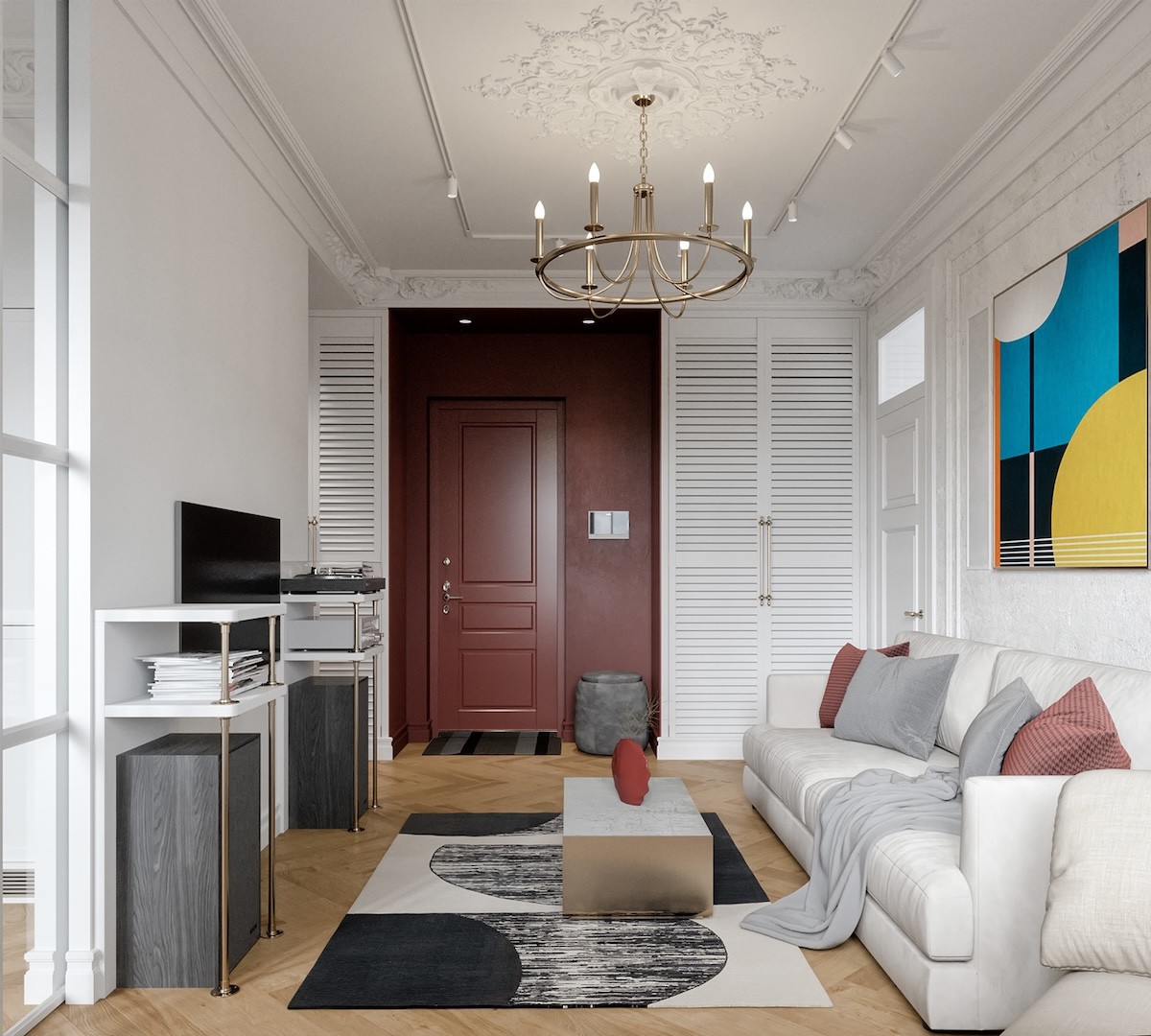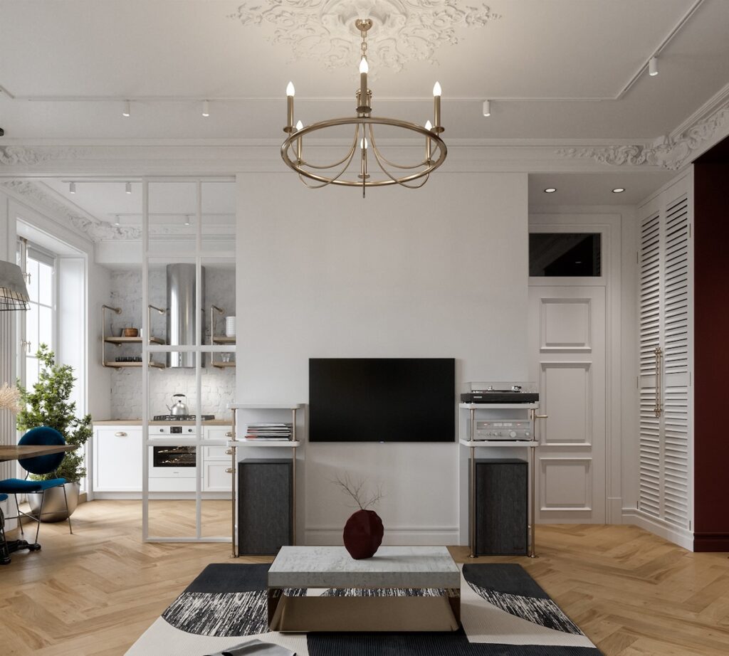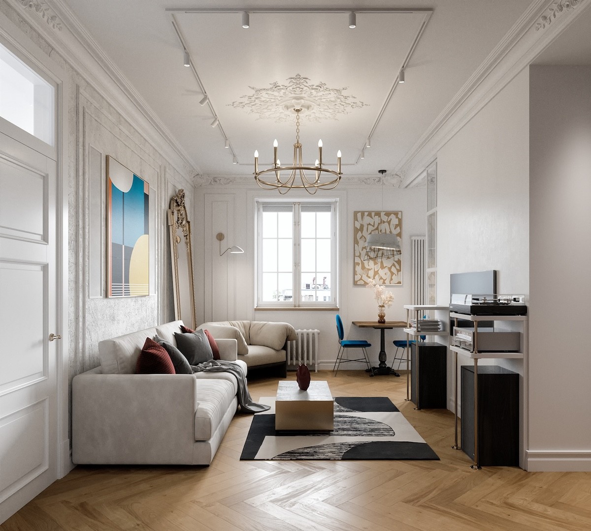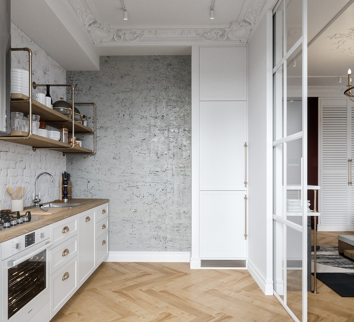 This loft apartment, a project by Maxim Shpinkov, captures the modern classic design in a small loft apartment. The project shows us how space may be a constraint in interior design—but it can be easily overcome with the proper design techniques! From wooden flooring to classic white walls, we see plenty of design secrets coming together to bring this space to life.