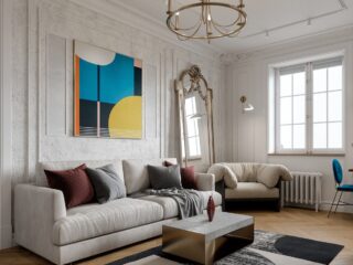 The stark white walls are a design secret to opening up a compact space (bonus points for the mid-century mirror, reflecting natural light as it enters from the window). But, simultaneously, we see the wooden flooring and soft furnishings factoring in warmth. This is complemented by bold punches of color introduced with artwork. A beautiful balance between contemporary and cozy is the final result.