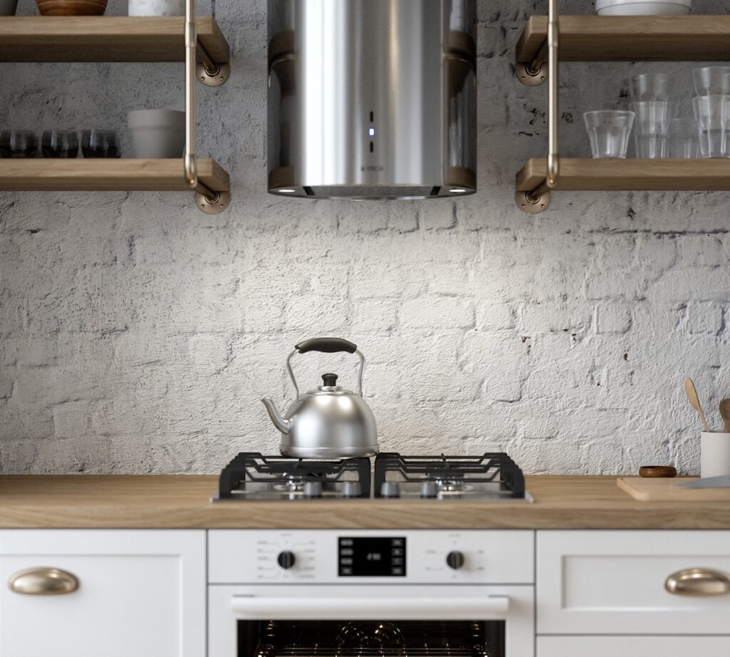 Walking past the dining table leads residents into the open and airy kitchen, featuring a stunning industrial style. The focal point of this space is the exposed brick wall with a whitewashed finish. The sleek white cabinetry provides hidden storage space, while the kitchen is kept from feeling cramped by adding open shelving (instead of upper cabinets). The gold hardware deserves a special mention for subtly adding luxury to this modern-rustic space.