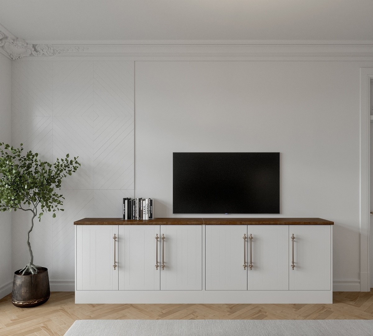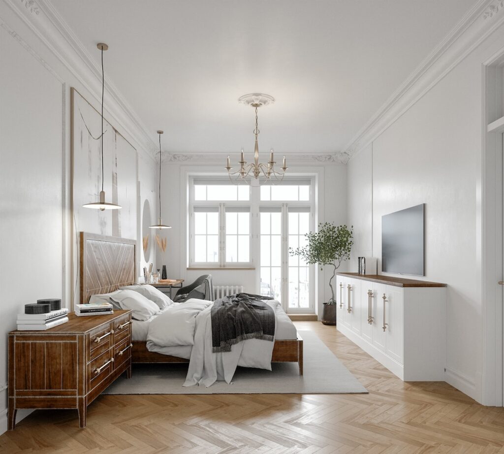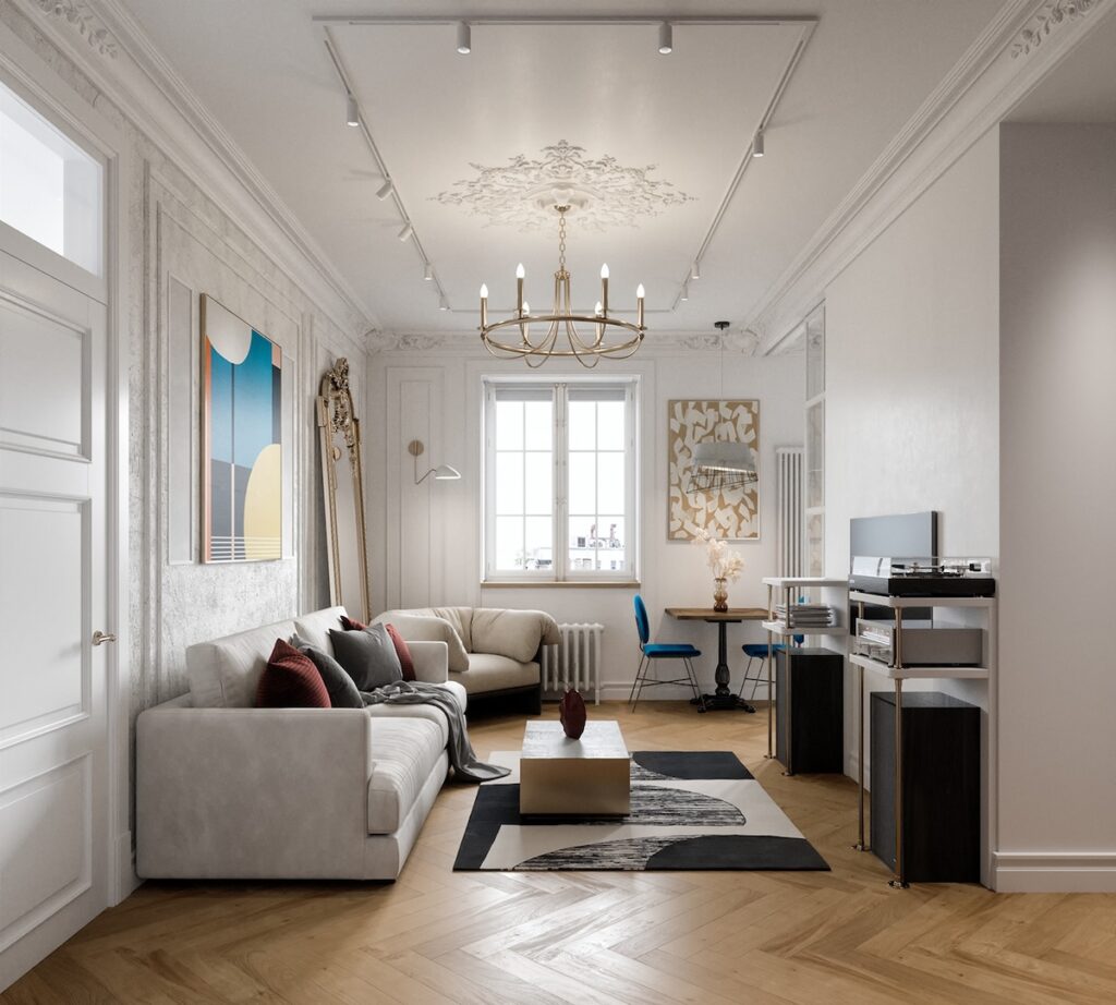 The living room is where we see the modern classic design in full action. The overall space has a modern and simple feeling. But when we look at the details… the chandelier and ceiling moldings nod to traditional elements. These add timelessness to the otherwise contemporary space.