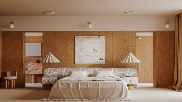 The upholstered bed becomes the focal point. Its soft pattern adds texture while staying neutral and understated. Layered bedding keeps the look relaxed and inviting. Sculptural pendant lights replace traditional bedside lamps, freeing up space and adding an architectural touch.