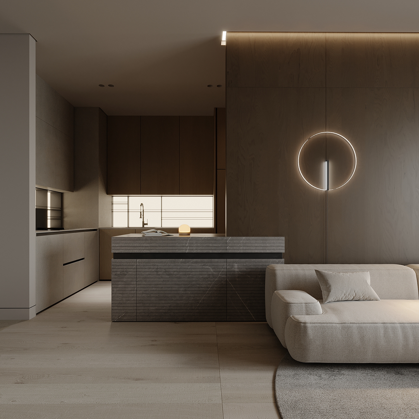 The kitchen in the Ember Apartment features an island as the partition—a space-savvy design trick. It is striped on one end and features a marble pattern on the other. If residents want to enjoy dining here, the island has potential to add on a few bar stools, too. The cabinetry is matte and hardware-less, adding to the modern vibe of the space.