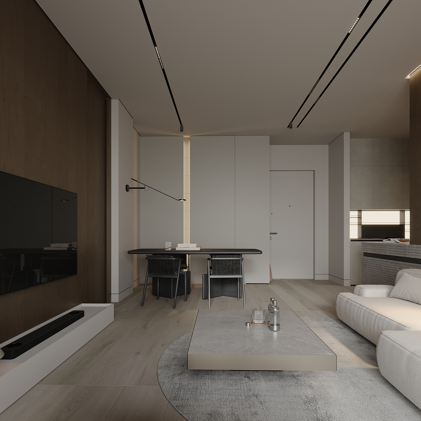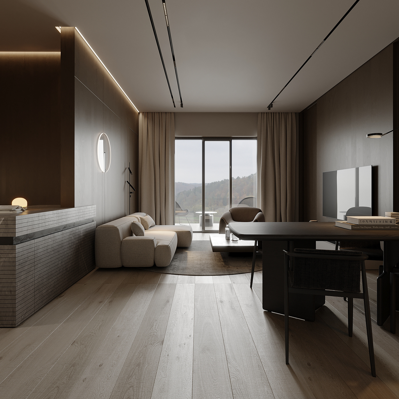 The open-plan living space feels spacious yet intimate. Its layout encourages relaxation and allows residents to effortlessly move around—despite the compact space. The area for lounging is positioned right next to the dining and kitchen areas, which fosters an organic flow of conversation.