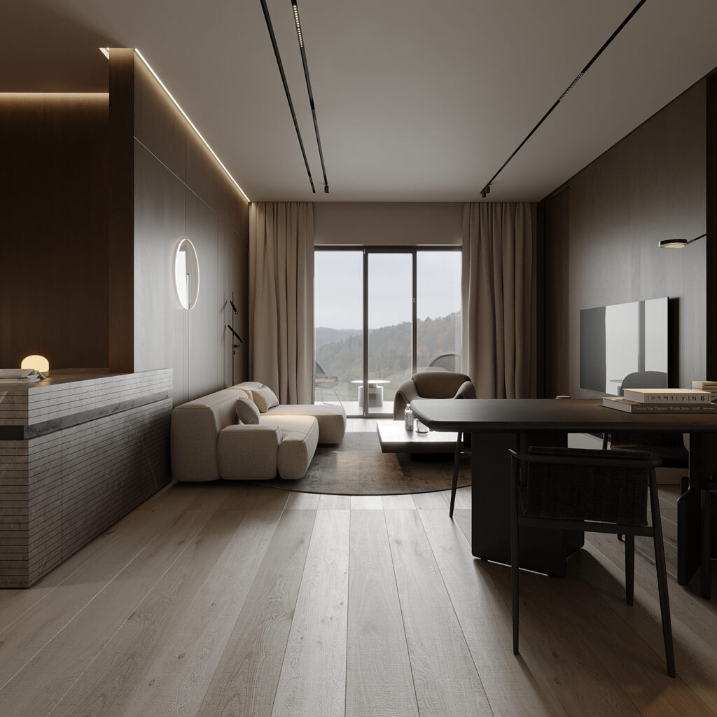 At the center of the living space is a low-profile modular sofa. Its rounded silhouette adds organic forms. The muted area rug softens the space underfoot. Opposite the sofa, a sculptural accent chair with fluid curves adds an artistic touch.