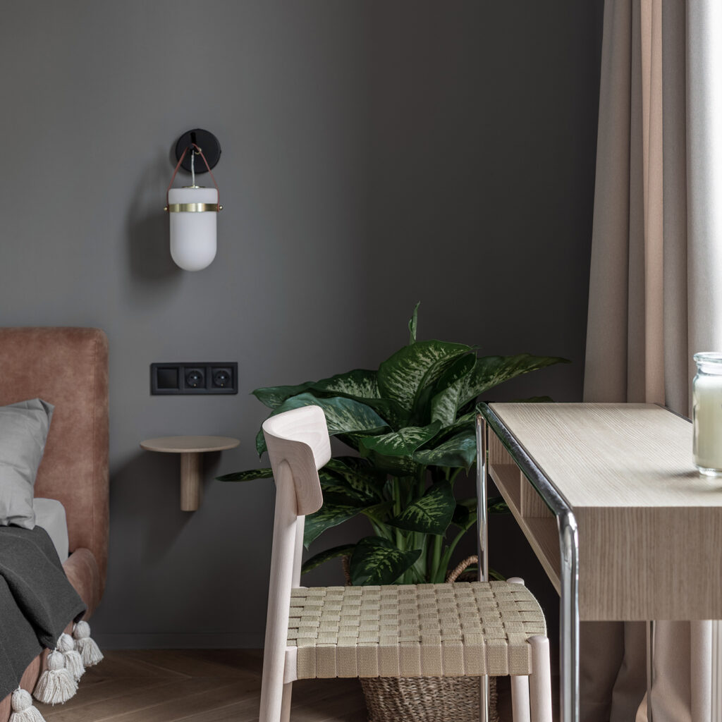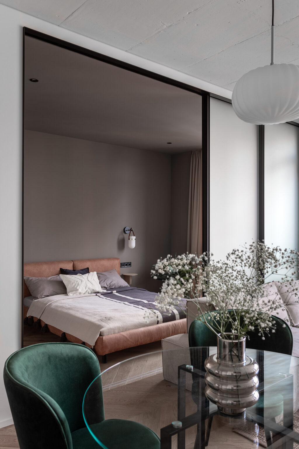 The bedroom in The Emerald Apartment proves that a compact space can still feel like a retreat. Separated by frosted glass panels, it has just enough privacy while still borrowing light from the rest of the apartment. The bed itself is low and cozy. It is dressed in soft neutral tones that make the room feel calm and uncluttered.
