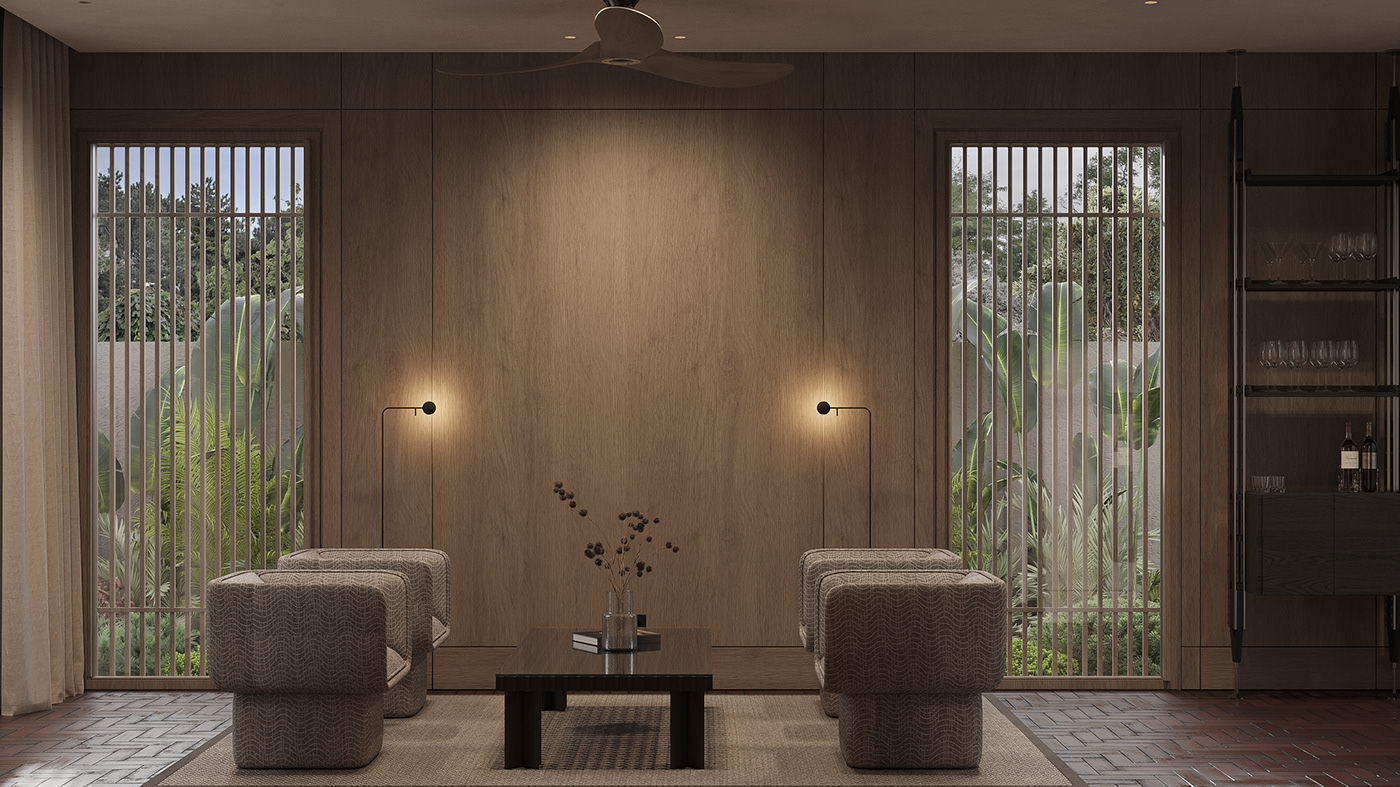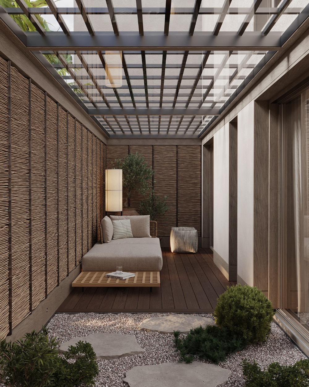 The bedroom opens directly to a private outdoor area, extending the sense of retreat. Woven wall panels, natural wood decking, and soft seating create a serene outdoor pause. This indoor–outdoor connection reinforces the core idea of the Inner Court House.