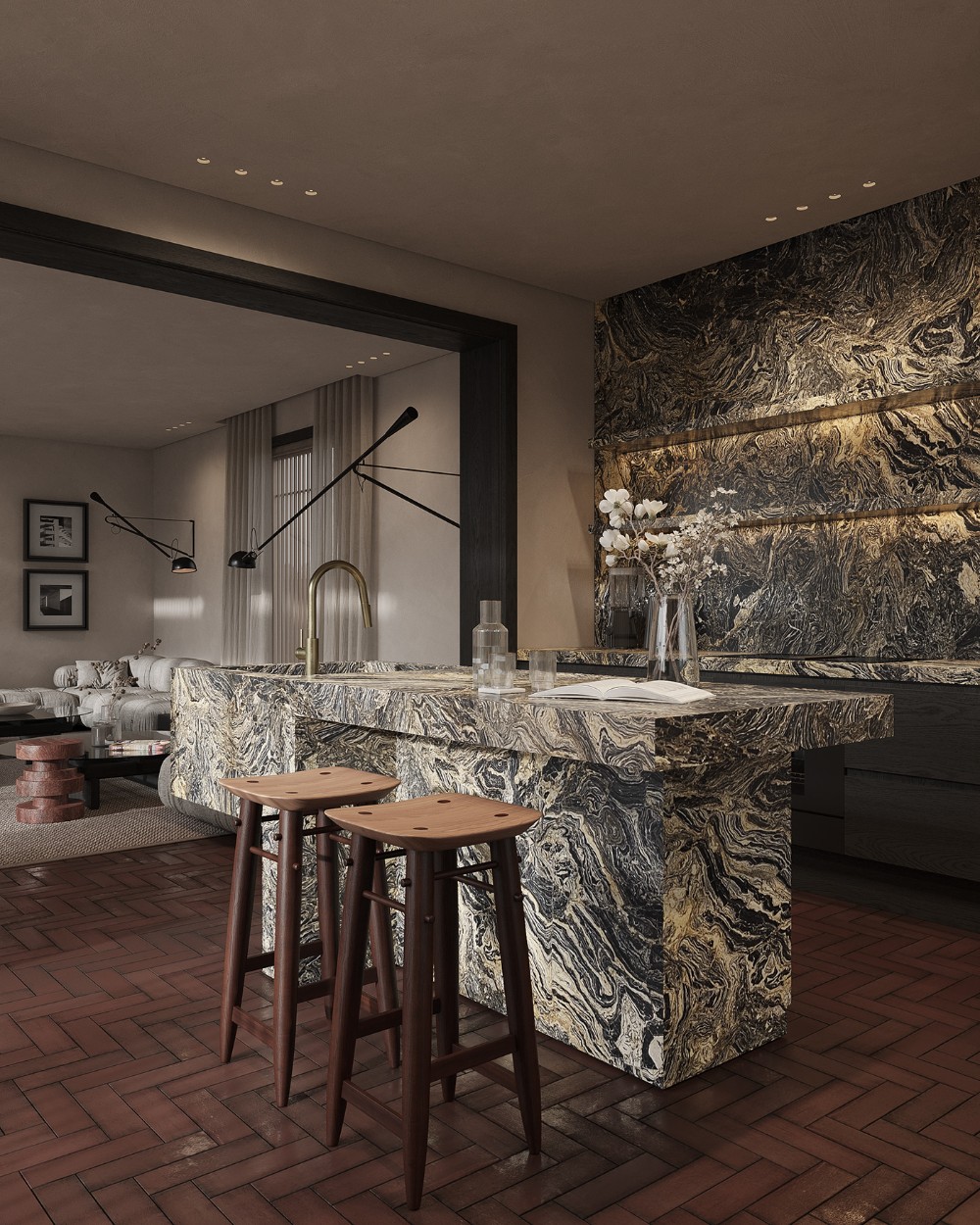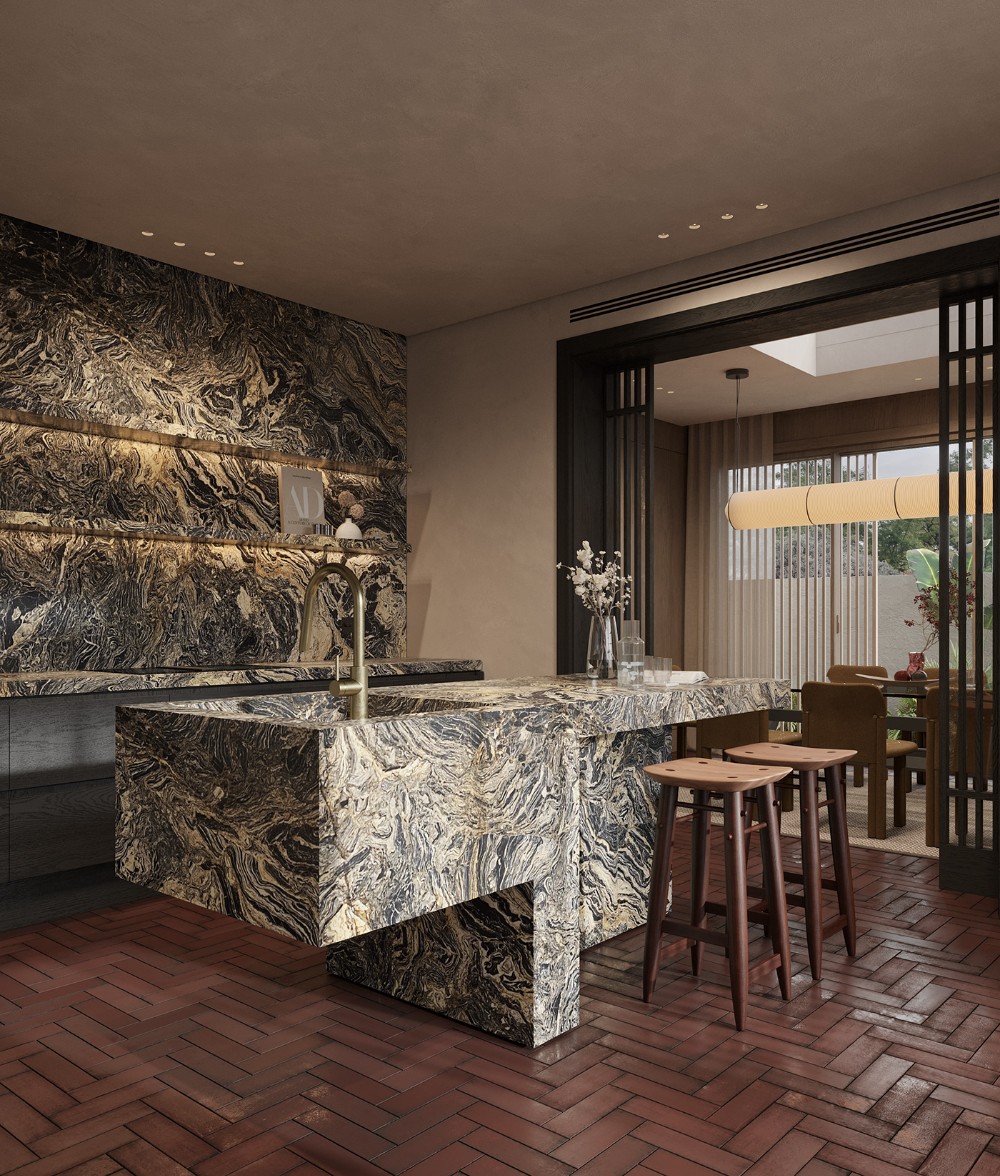 The kitchen is bold but restrained. The stone island becomes a natural focal point, almost sculptural in form. Its rich veining adds contrast against the otherwise quiet palette. Bar seating keeps the space social and informal, making the kitchen feel like part of everyday living rather than a closed-off zone.