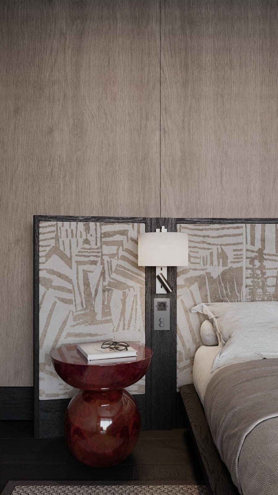This bedroom is calm and understated, designed as a quiet retreat. Warm wood paneling and a soft neutral palette create a cocooned feel, while clean lines keep the space visually light. The low bed and subtle patterned headboard add gentle texture without distraction. Soft daylight filters through layered curtains, and a small seating area by the window offers a moment to pause and unwind.
