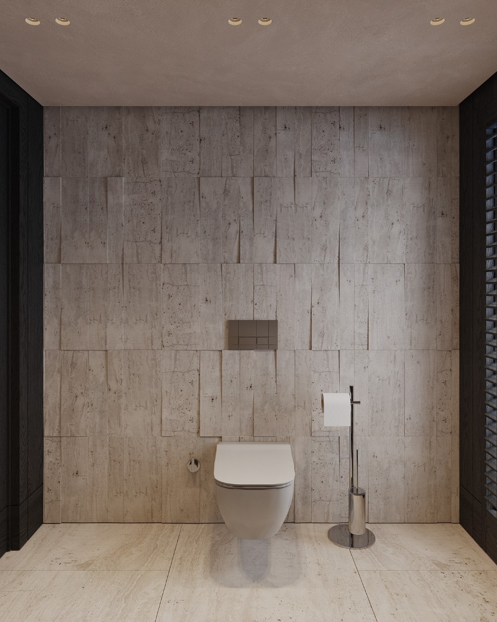 This bathroom is calm and sculptural. The textured stone backdrop and soft veining create a spa-like atmosphere. A sculpted stone basin becomes the focal point, paired with a clean-lined vanity and minimal fixtures. Soft wall lighting and a statement mirror add warmth without visual clutter.