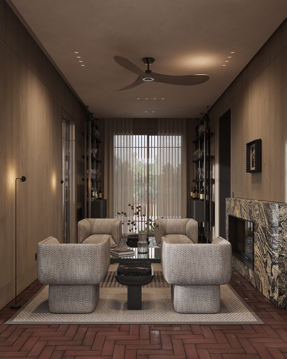 This seating area more intimate than the main living area, yet just as considered. The layout is symmetrical and calm, anchored by the fireplace, which naturally becomes the emotional center of the room.