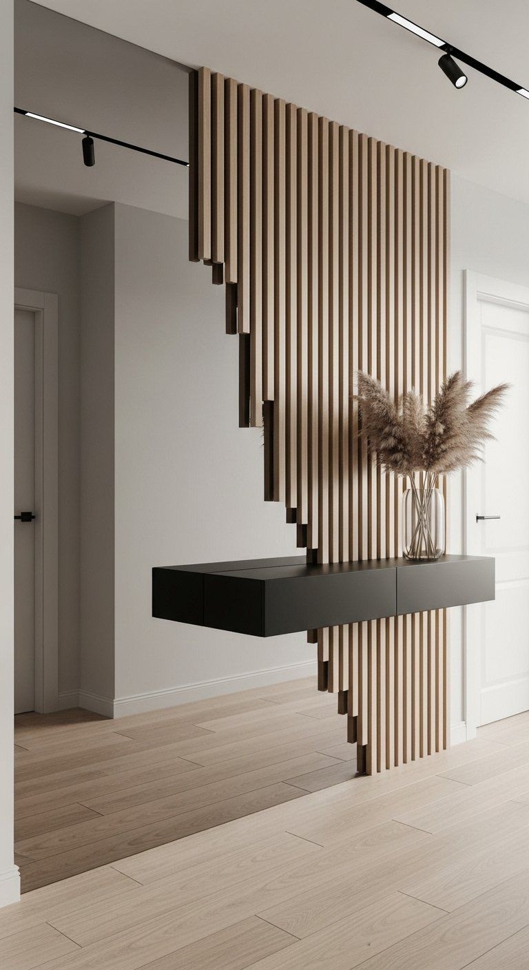 Noise control has become part of privacy. Acoustic panels, fabric wall coverings, or wood slats with backing absorb street sounds and hallway echoes. This buffer protects your interior atmosphere when the door opens frequently. Conversations remain softer. External chaos fades quickly. The entry becomes a transition space for sound as much as movement. It supports calmer living without relying on heavy construction or expensive soundproofing.