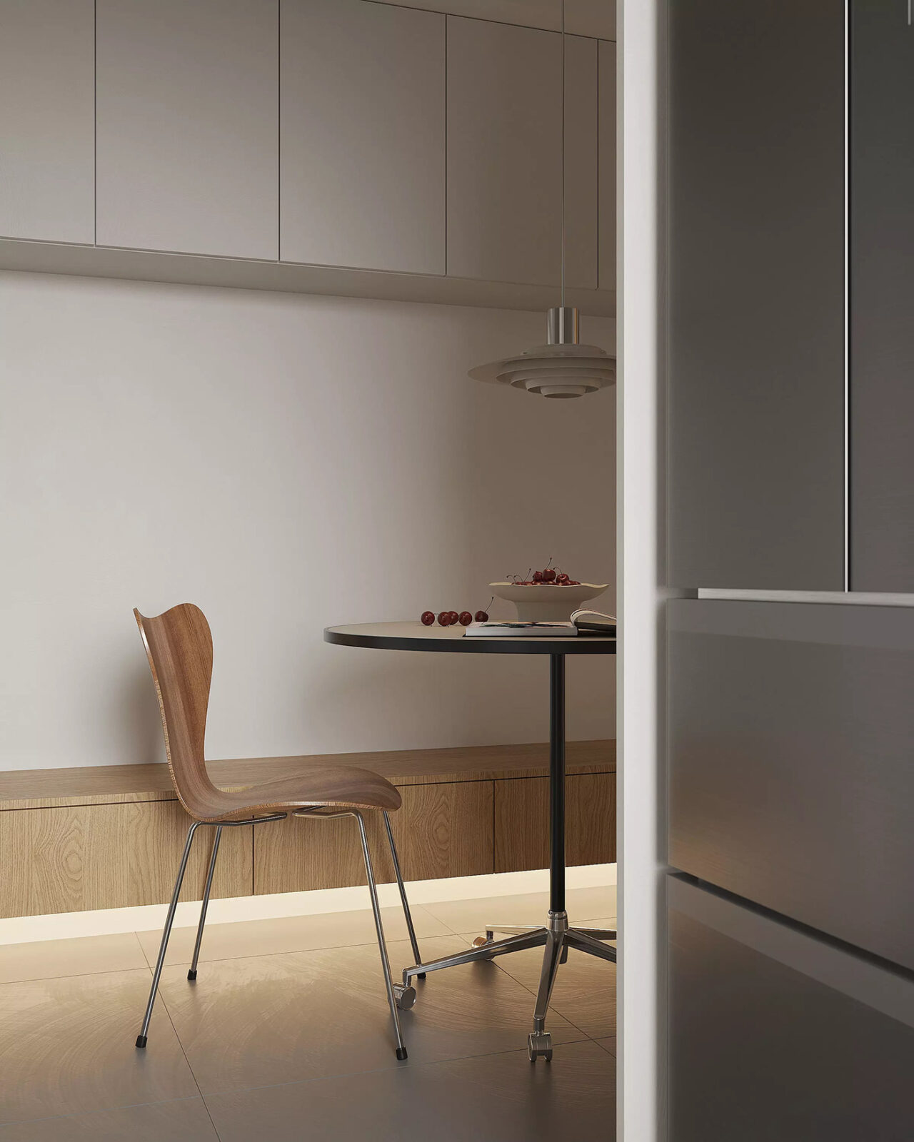 The breakfast nook sits neatly along the wall with a round table and built-in bench seating. Overhead cabinetry stays minimal, so the whole corner reads clean and calm. Nearby, the reading nook works like a soft pause in the layout; a single chair against warm oak paneling is all it needs.