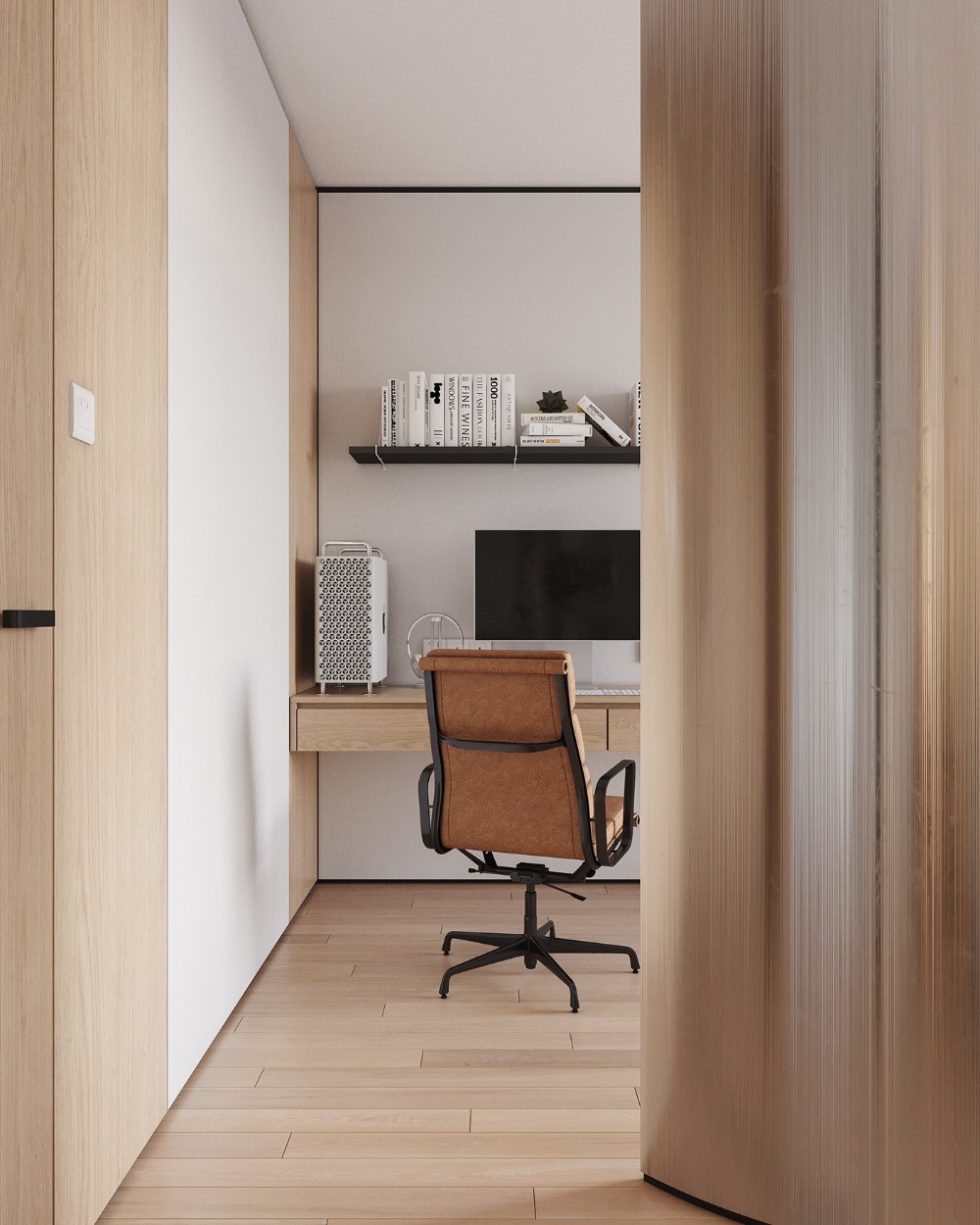 The oak paneling wraps the space, and the soft lines make it feel extra cozy. The transitions stay seamless, too, so the room flows as one, clean composition instead of separate parts. Even with simple furniture and a neutral palette, the room still holds presence.