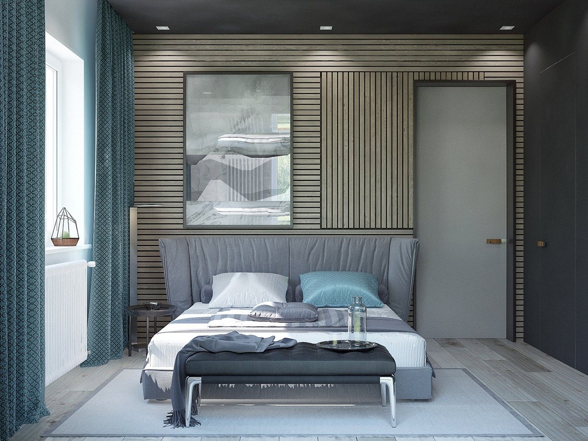 Uplift a black bedroom decor scheme with a block of light wood tone.